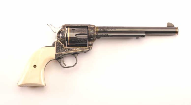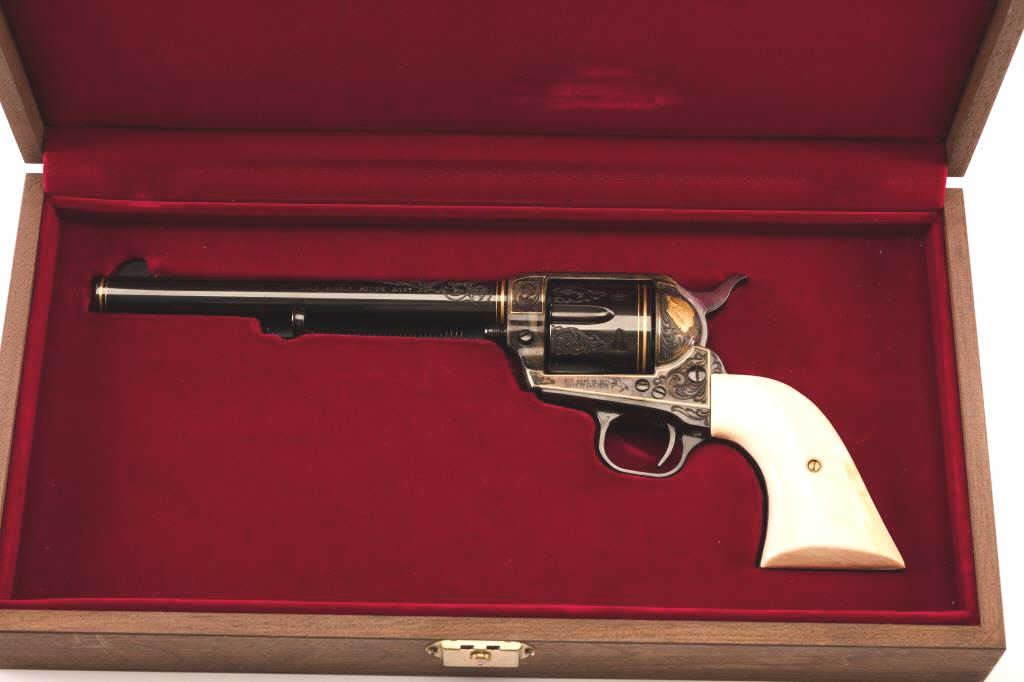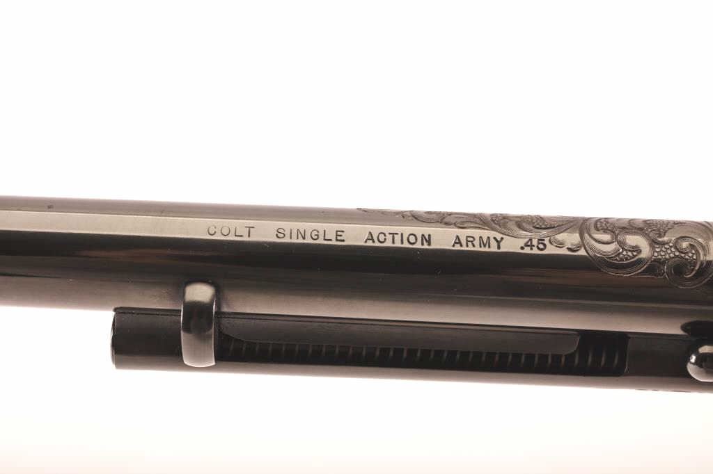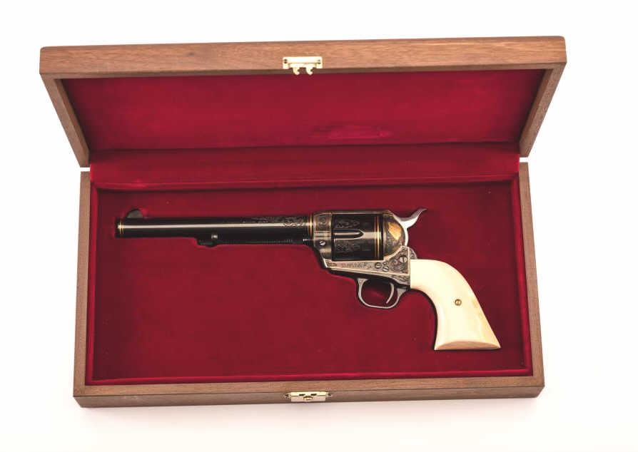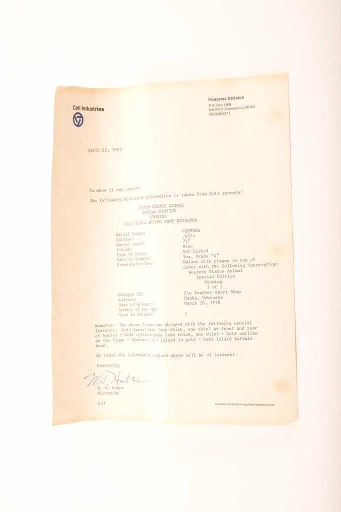 Colt Single Action Army United States Animal Special Edition Wyoming revolver, .45 caliber, Serial #92898SA. The pistol is as new in the factory fitted wooden case. The pistol features a 7 ½” barrel with gold bands at the muzzle and in front of the cylinder, A Grade engraving and vivid case colors on the frame. The pistol is factory engraved with gold inlay including a great buffalo head at the left rear of the action. Thepistol has nice smooth ivory grips. The lot includes a factory letter dated April 22, 1982 indicating the pistol was shipped on March 20, 1978 to Fin Feather Sport Shop in Omaha Nebraska. The letter confirms allfeatures and notes the Walnut presentation case with plaque inscription: “Western States Animal Special Edition Wyoming 1 of 1”. The letter further remarks, the firearms special features including two gold barrelbands, two gold cylinder bands, gold outline on frame, numbers 1 of 1 inlaid in gold and a gold inlayed buffalo. The Walnut display case is in very good condition with burgundy velvet interior. Est.: $4,000-$8,000.