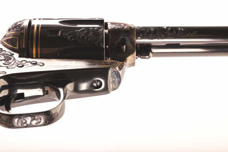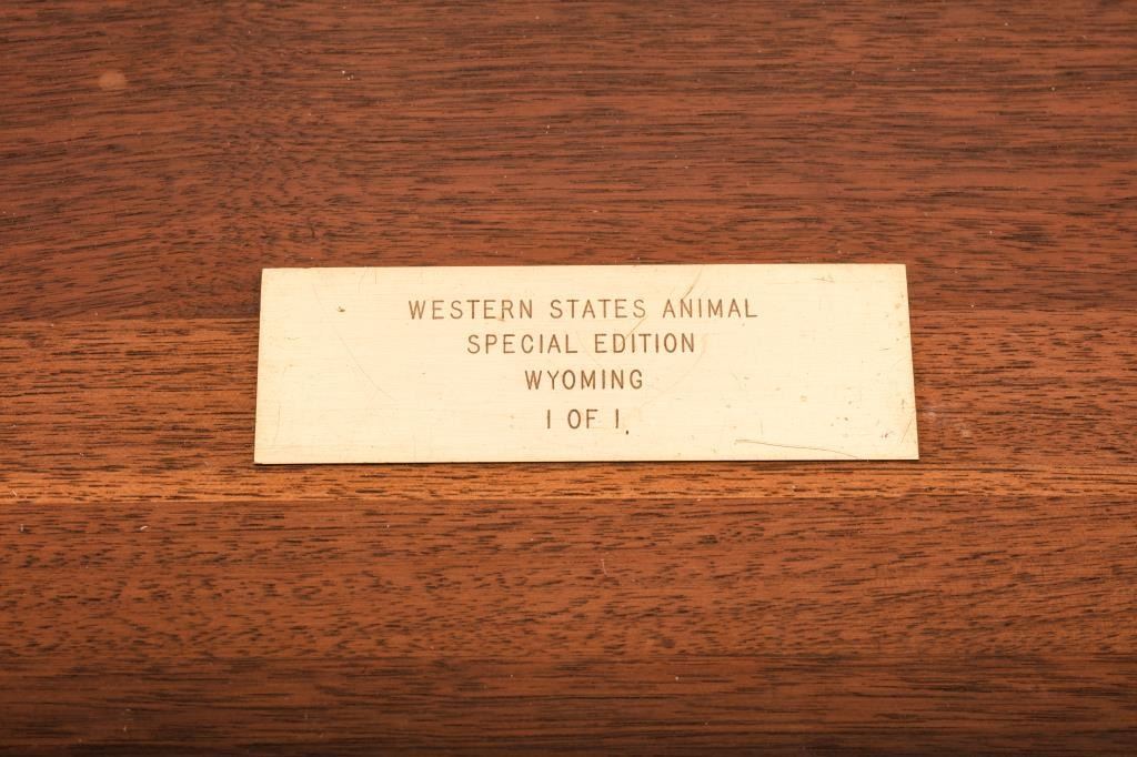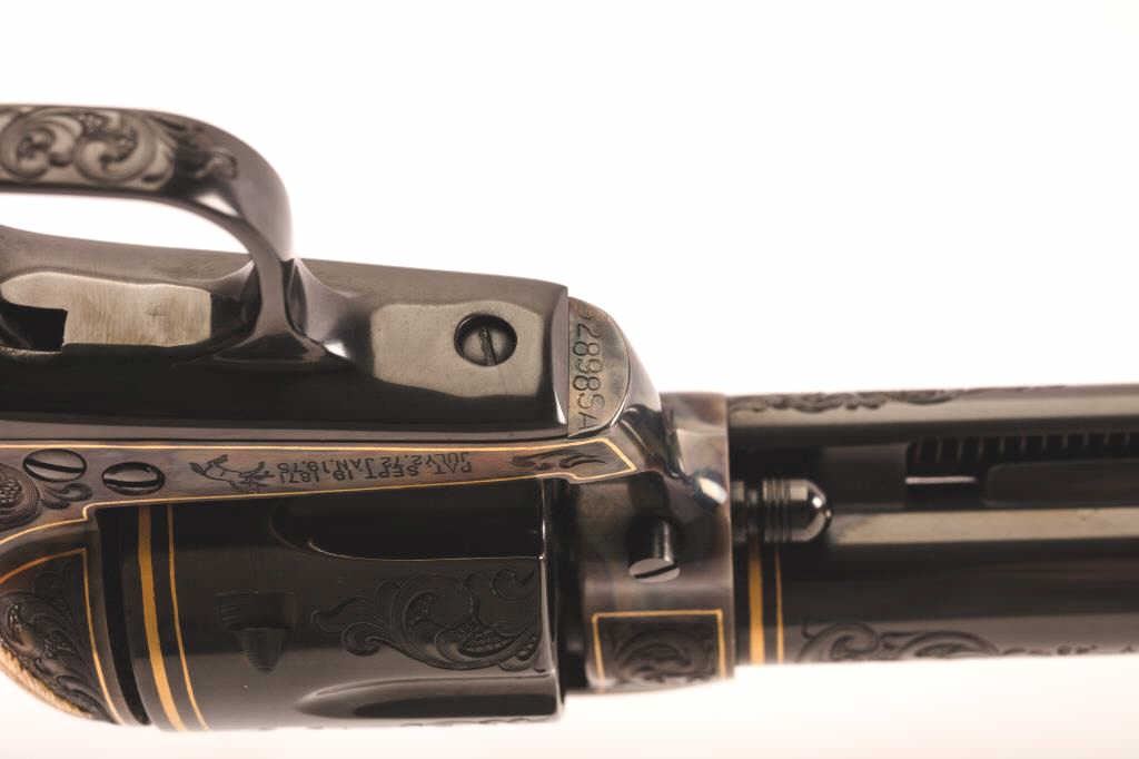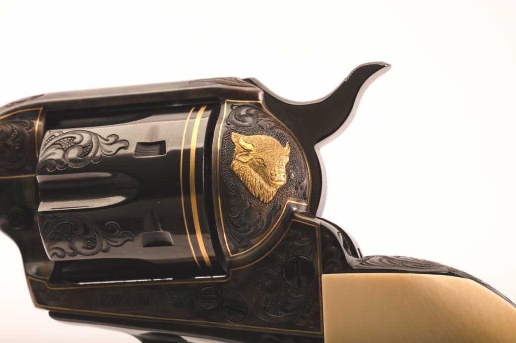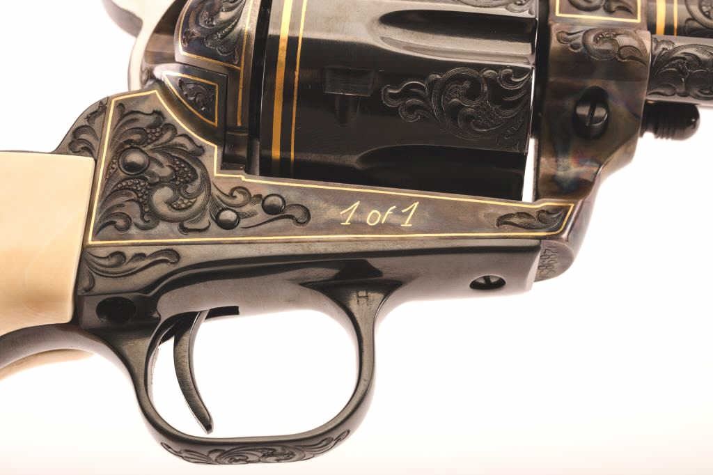 Colt Single Action Army United States Animal Special Edition Wyoming revolver, .45 caliber, Serial #92898SA. The pistol is as new in the factory fitted wooden case. The pistol features a 7 ½” barrel with gold bands at the muzzle and in front of the cylinder, A Grade engraving and vivid case colors on the frame. The pistol is factory engraved with gold inlay including a great buffalo head at the left rear of the action. Thepistol has nice smooth ivory grips. The lot includes a factory letter dated April 22, 1982 indicating the pistol was shipped on March 20, 1978 to Fin Feather Sport Shop in Omaha Nebraska. The letter confirms allfeatures and notes the Walnut presentation case with plaque inscription: “Western States Animal Special Edition Wyoming 1 of 1”. The letter further remarks, the firearms special features including two gold barrelbands, two gold cylinder bands, gold outline on frame, numbers 1 of 1 inlaid in gold and a gold inlayed buffalo. The Walnut display case is in very good condition with burgundy velvet interior. Est.: $4,000-$8,000.