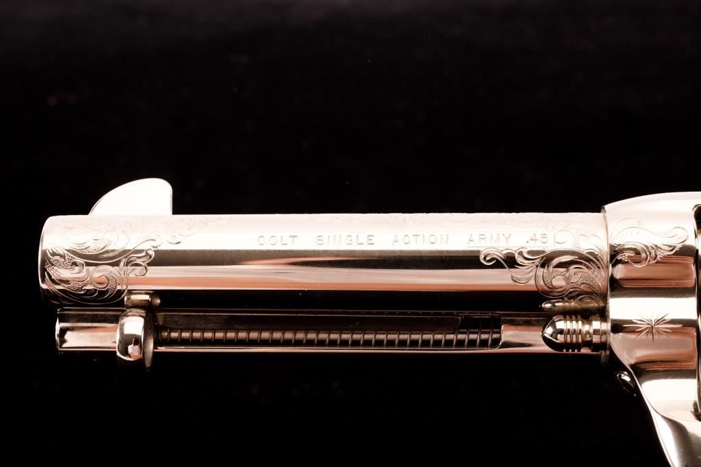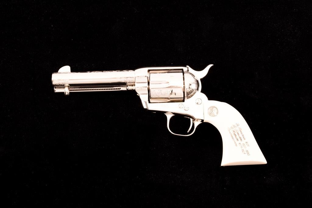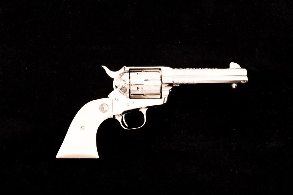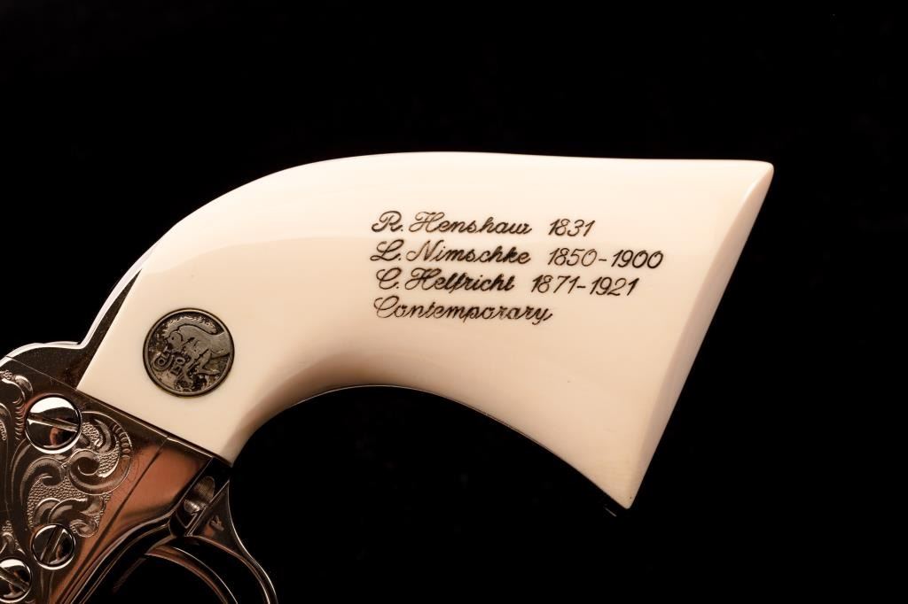 Colt Third Generation SAA factory engraved “Engravers’ Sampler”; .45 caliber, 4.75” barrel, nickel finish, factory Colt medallion ivory grips, S/N SA68324; in like new condition with factory wood grained cardboard box with inserts and instructions manual; end label of box numbered to this gun. (Modern/PPT). Est.: $2,000-$4,000.