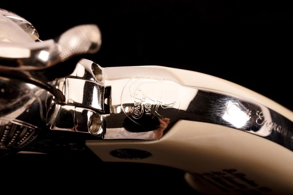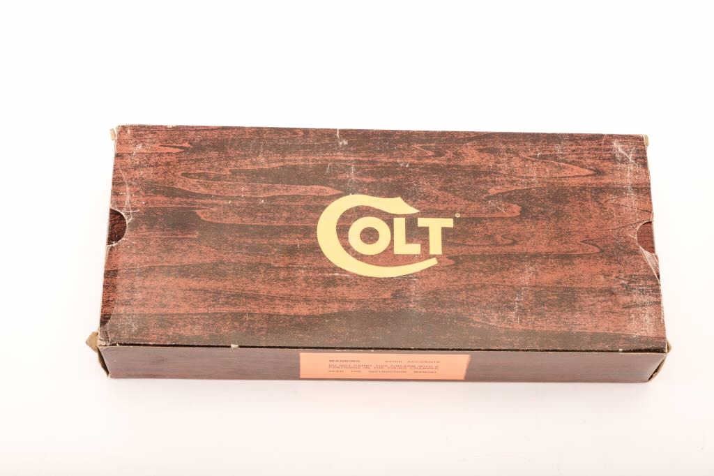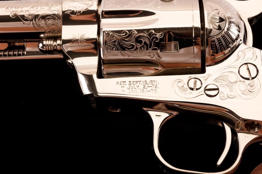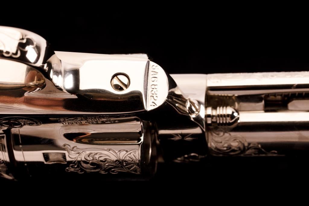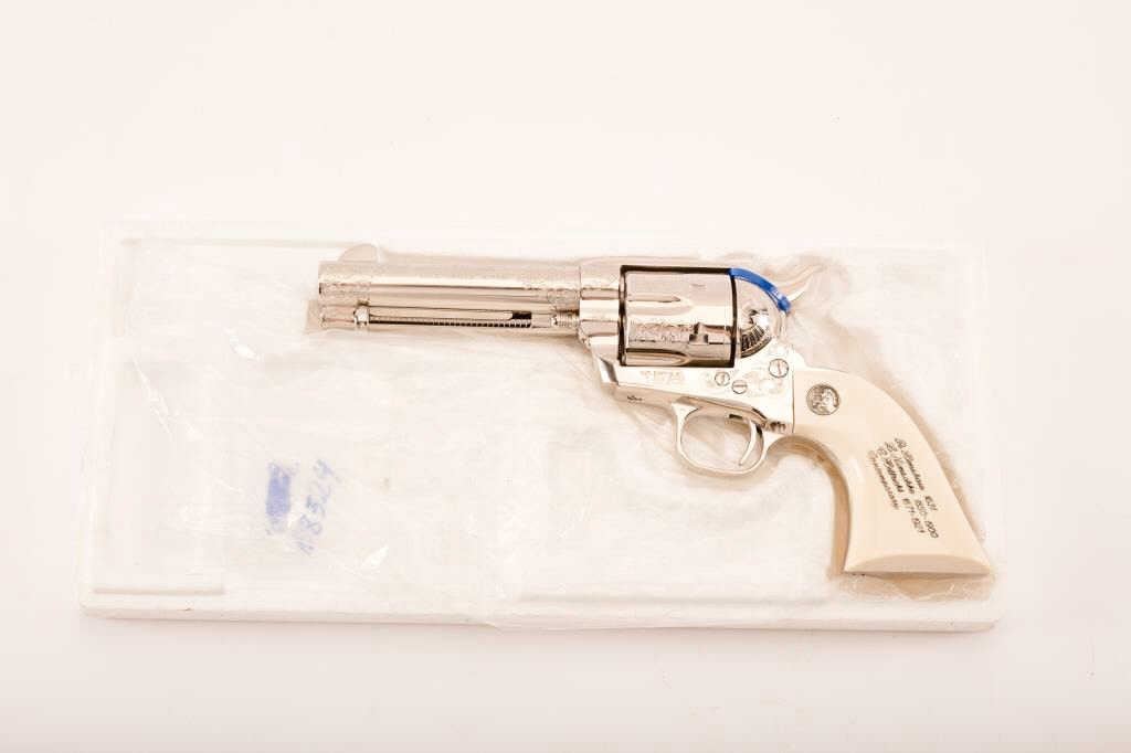 Colt Third Generation SAA factory engraved “Engravers’ Sampler”; .45 caliber, 4.75” barrel, nickel finish, factory Colt medallion ivory grips, S/N SA68324; in like new condition with factory wood grained cardboard box with inserts and instructions manual; end label of box numbered to this gun. (Modern/PPT). Est.: $2,000-$4,000.