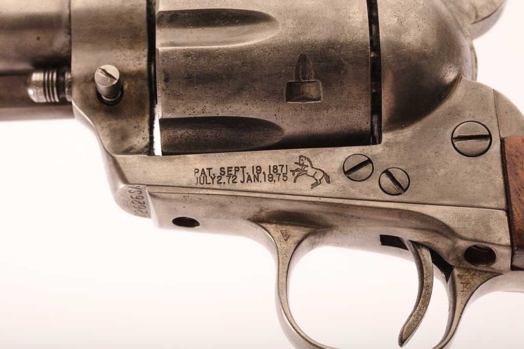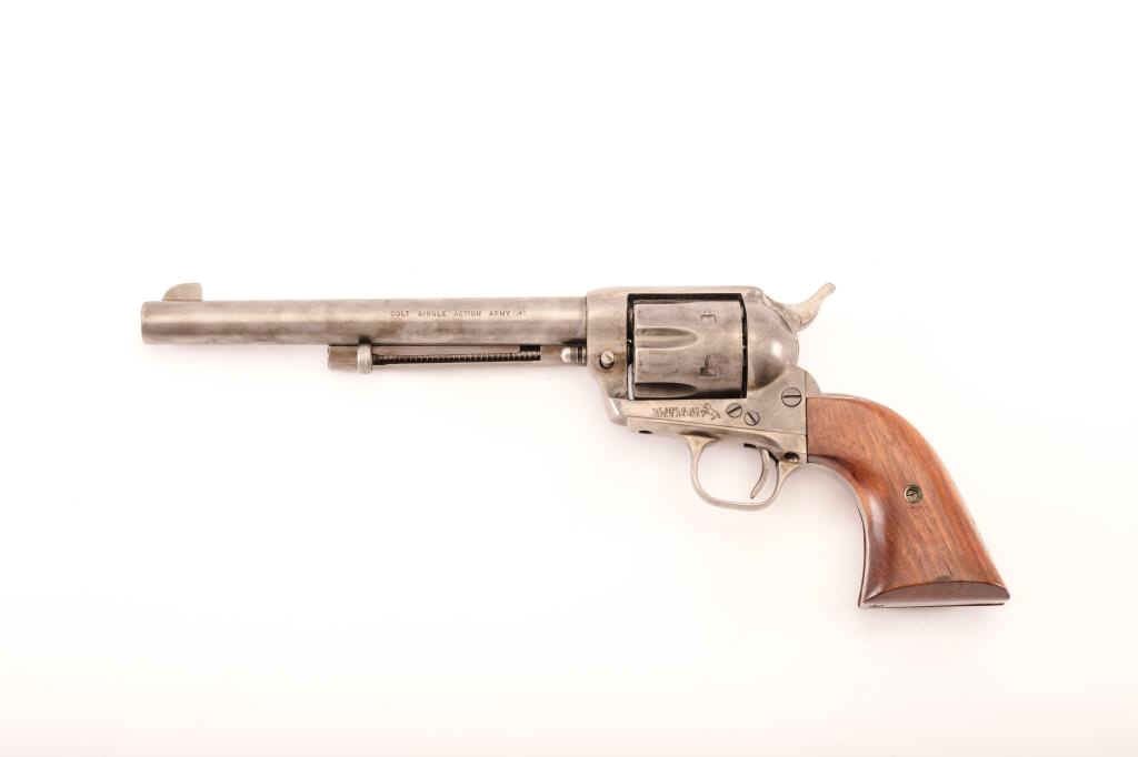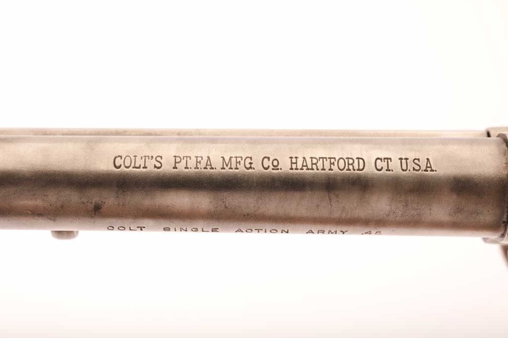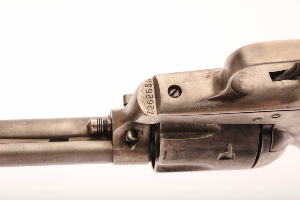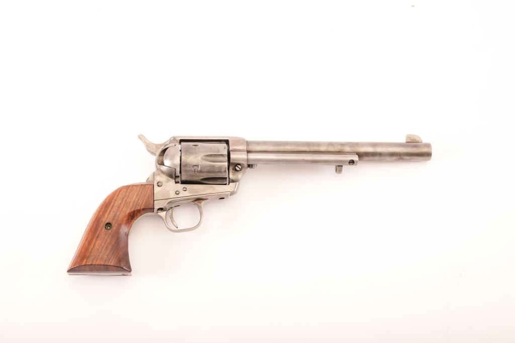 Colt Second Generation SAA revolver, .45 caliber, 7.5” barrel, stripped and antiqued for re-enactor at “End of Trail” shoot, replacement wood grips, S/N 72626SA; overall good condition with good action, crispmarkings and very good replacement grips. (Modern/PPT). Est.: $800-$1,600.