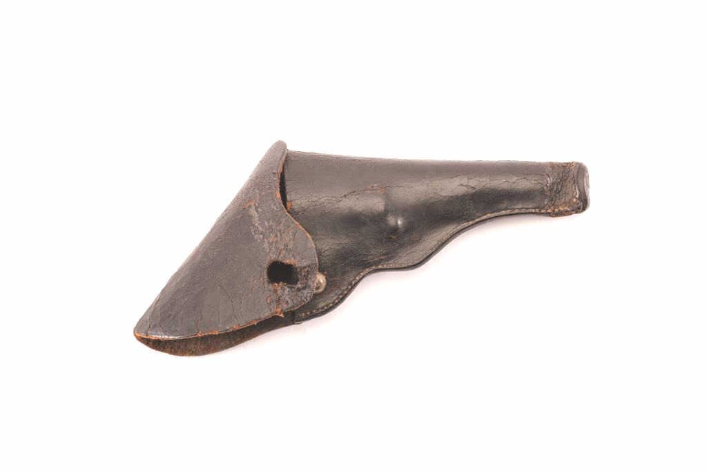 Un-marked small leather flap holster in overall fair + condition with some scattered crazing of top layer of leather and small old tear to flap “button” hole. Appears to be for a Smith & Wesson First First or FirstSecond Model spur trigger revolver or similar small pocket pistol. Est.: $50-$100.