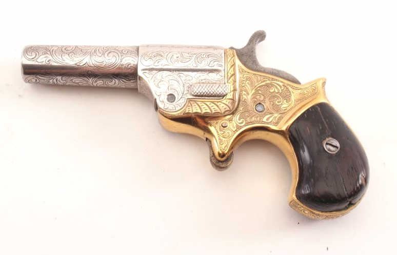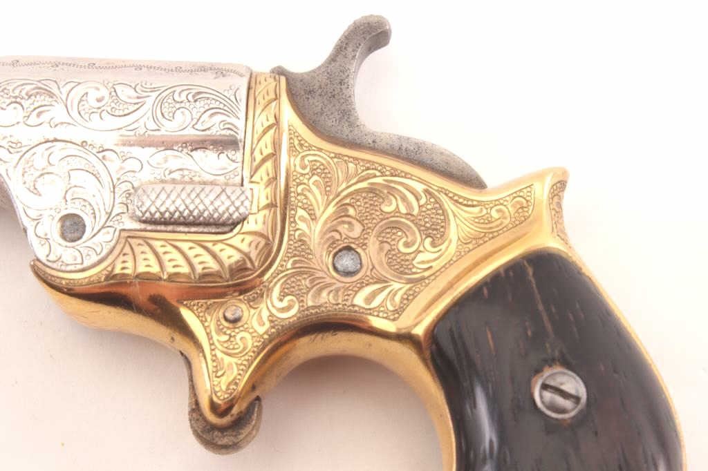 Ballard .41 caliber derringer period fancy scroll engraved with gold and silver finish and wood grips. Good sharp address and crisp edges with 90%-95% silver and gold remaining. The grips show wear and exposure and thebore is worn from use. The original owner actually carried it and shot it a great deal. Sophisticated collectors only know of a handful engraved. Formerly Herbert G. Ratner collection. (Antique) Est.: $5,000-$10,000