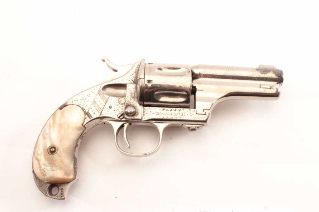 Merwin & Hulbert “Pocket Army” .44-40 caliber floral intaglio or period pinprick engraved with re-nickel plating and pearl grips, S/N 1778. 85%-95% old re-nickel finish remains and areas where finish has lifted shows graymetal patina and minor pitting and erosion. The marking on the frame are slightly weak but visible. The panel on the left shows birds. The front has been reduced and the grips are aged but good condition overall.Cocking but not locking. The bore is slightly rough. Western frontier era. (Antique) Est.: $2500-$5000