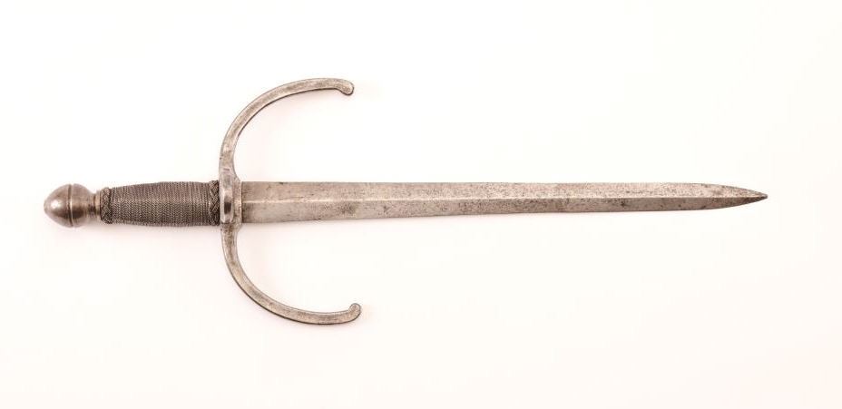 17th century left handed dagger probably German measuring 19” overall with a 14” blade measuring 1 ¼” across the ricasso. The blade shows A well-defined raised median ridge and tapering gradually to pint. Wide guarddesigned to “Catch and Turn” sword blades measuring 6 ½” to outer edge. Nicely wire wrapped grip with large pommel. Good overall condition showing minor lamination flaws in forging along with moderate to light pitting. Very good condition overall. Style of 1580 to mid-17th century. Est.: $2000-$4000