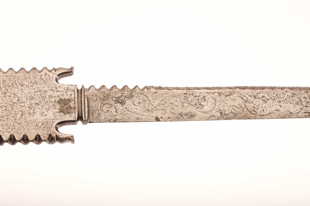 Authentic and period “Main Gauche” or left handed dagger circa 1580 to 1650. Measures 25” overall with 19 ½” blade measuring 17 1/8” at the widest part of ricasso. The blade shows strong traces of engraving including a Spanish style cross and name on blade that’s almost legible. The carved wood grip is original. Shows very high quality with finely pierced guard and turned quillons (10 ¼” across). Suitable for sophisticated armour or edged weapon collection. Est.: $6,000-$12,000