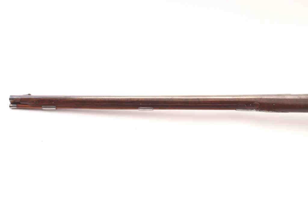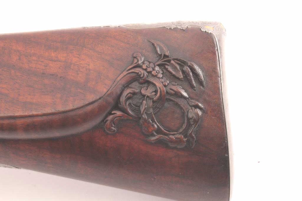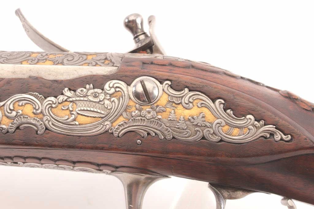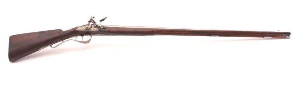 Hi art European Musket in German style circa Mid-18th century probably made for a royal cabinet of arms or nobility. The gun measures 49 ¼” overall and 35” barrel of .60 caliber smoothbore. The gun shows fine high reliefchiseling on the barrel, lock and mounts. The backgrounds are hammered gold inlaid. The chiseling shows stags, scrolls, florals and dogs in hunting motifs. The lock is scalloped around the edges. The stock is relief carved and the wrist is checkered with wonderful border molding checkered with wonderful border molding of best quality. The lock is original flintlock with correct small parts. The arm is in excellent as museum qualitycleaned to bright condition with sharp metal surfaces and pristine chiseling with sharp edges. The rear of the barrel shows 9 ½” of great chiseling from tang forward. A master’s work fit for royalty. (Antique) Est.:$12,500-$25,000
