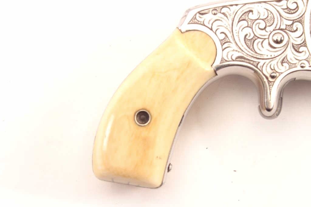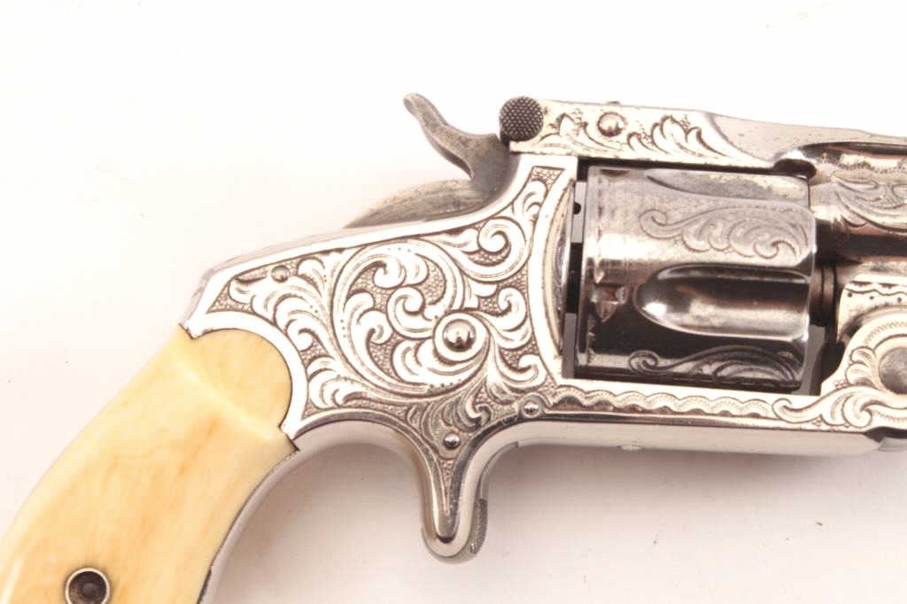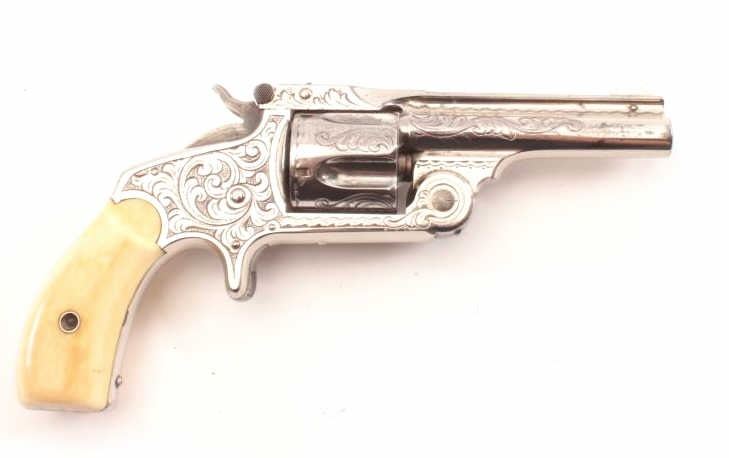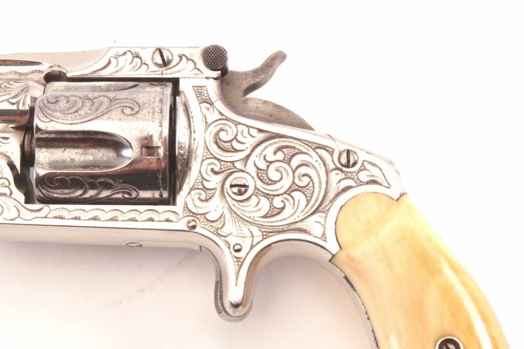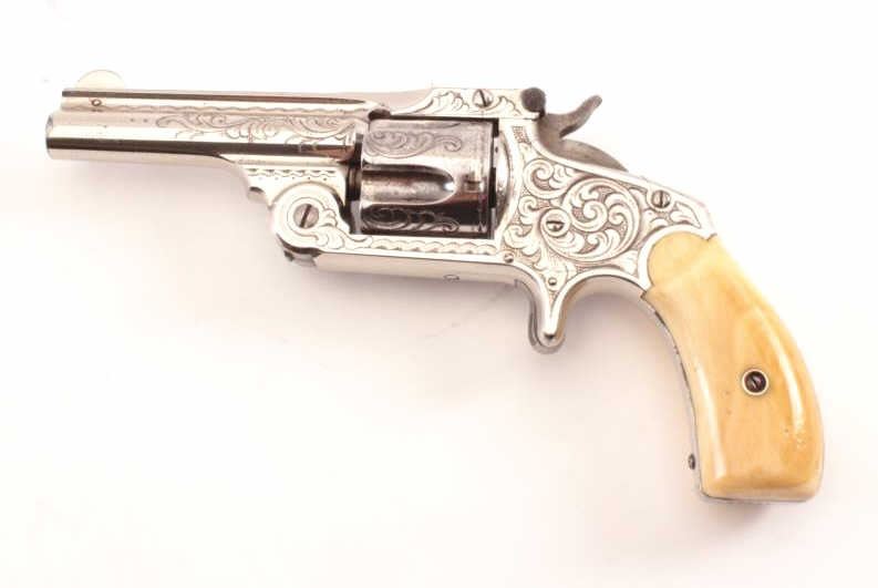 Exceptional New York Engraved Smith & Wesson 1st Model .38 canter fire single action revolver attributed to L.D. Nimschke’s shop, S/N 36605 with standard 3 ¼” barrel, nickel finish, and authentic to the period ivorygrips. This revolver shows tight and well detailed Germanic scrolls with typical L.D.N. ropes and borders. The pistol remains in near fine condition with 95%+ original nickel, sharp address and crisp edges. Someminor aging on the front of the cylinder. The grips are near fine with pleasing yellow patina and slight aging with impeccable fit. The hammer and small parts show generous amounts of original finish. The action istight. A strong 9 on a 1-10 scaler. (Antique) Est.: $2500-$5000
