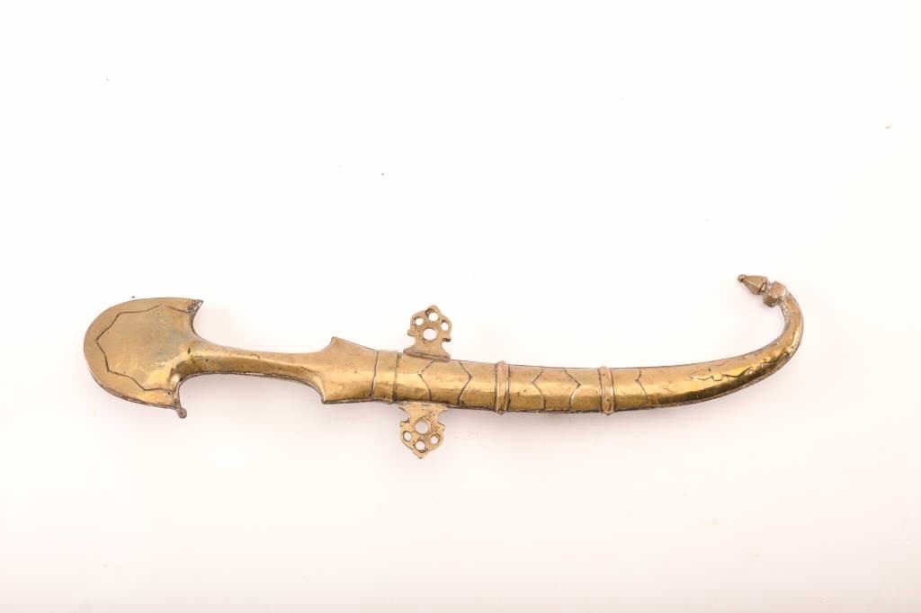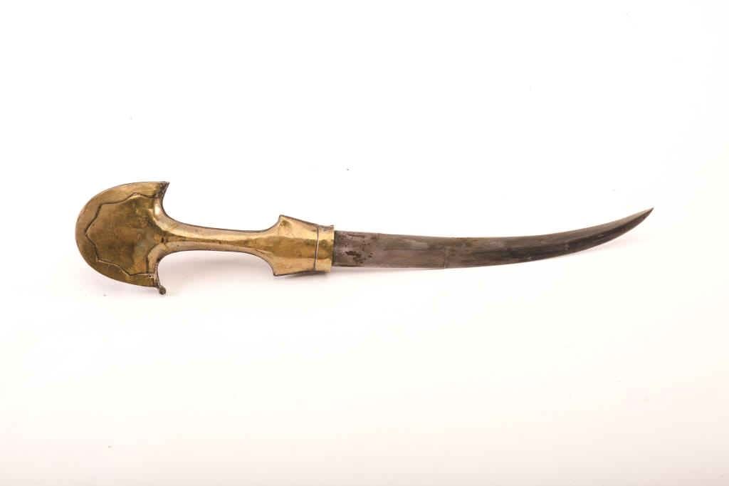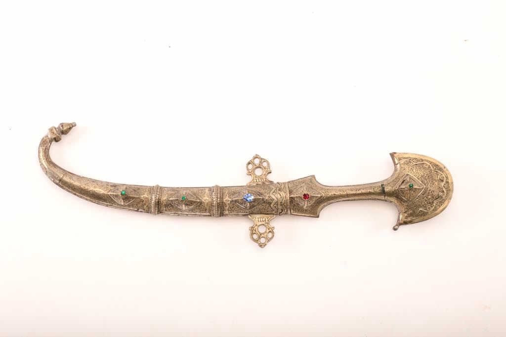 A Moroccan Koummya dagger circa Mid-20th century. Engraved brass mounts. Raised diamond sections topped with glass “jewels”. Curved steel blade. Good condition. Missing metal ball on one side of the handle.Measures 16 ½” long. Est.: $50-$100