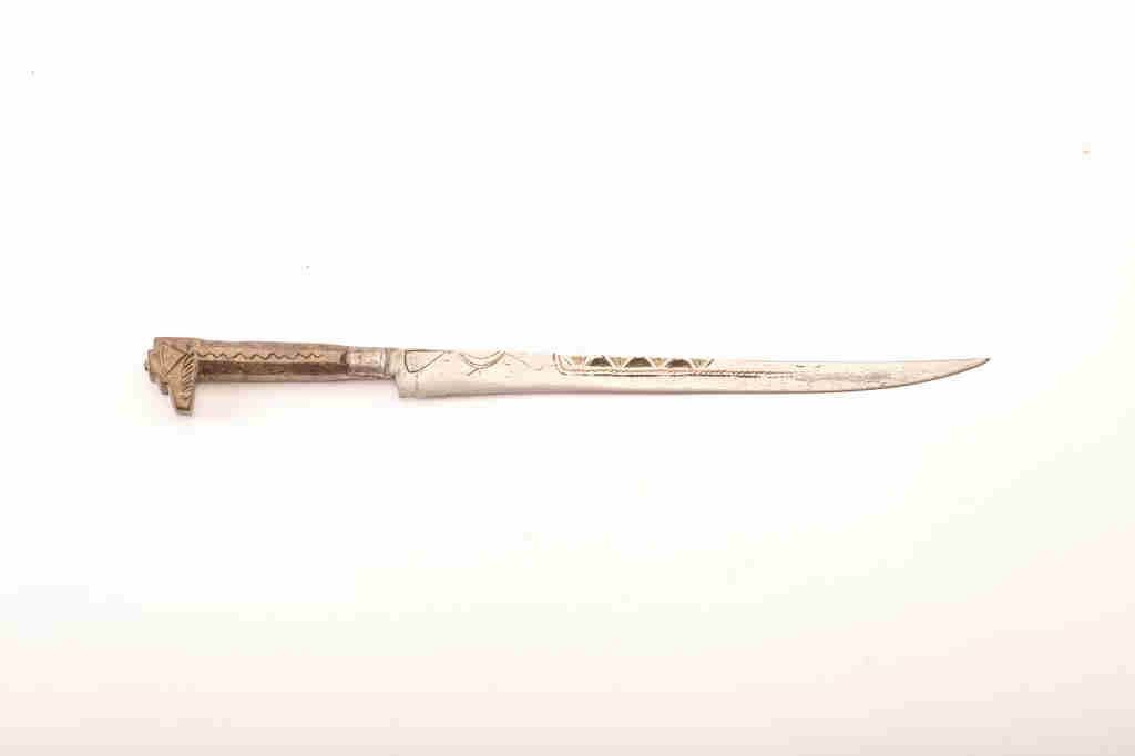 A Flyssa dagger from the Kayble people of Algeria circa early to Mid-20th century. Engraved brass handle. Steel blade with brass inlays and engraved geometric patterns. Good condition. Measures 14 ½” long. Est.:$50-$100