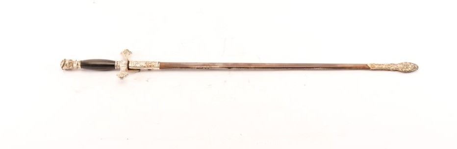 Knights of Columbus sword by Lynch & Kelly of Utica, New York with steel scabbard and case. The sword is 35” in total length with a 28” etched blade. The blade is marked Lynch & Kelly at the handguard and Knights of Columbus on the blade. The handguard is cast with a smooth plastic grip and knight’s head pommel. The steel scabbard shows moderate surface rust with ornamentation at the throat and toe. The lot includes aleather handled canvas case in fair condition. Est.: $100-$200