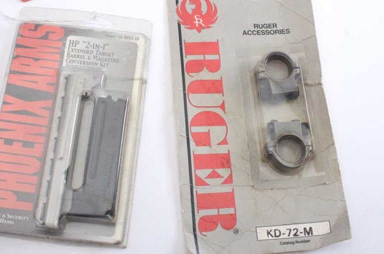 Lot of Misc. accessories from collector. Phoenix Arms .22 barrel and mag for Phoenix Arms pistol in packaging and unused, scope mounts, various parts and accessories. Good reproduction Winchester 94 rifle sights,Garand rear sight, screws and internal parts. Out of gunsmith’s drawer of “Junk “collector over 50 years. Est.: $150-$300