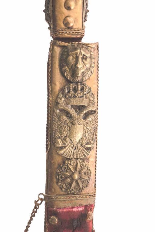 Unusual Eastern European short sword with ornate cast brass mounts in double eagles with portrait of noble women (Catharine the great?), lions, and a combination of European and Middle Eastern stylings. Very rustedblade painted red to preserve. Measures 26” overall with a 21” blade. Est.: $350-$700