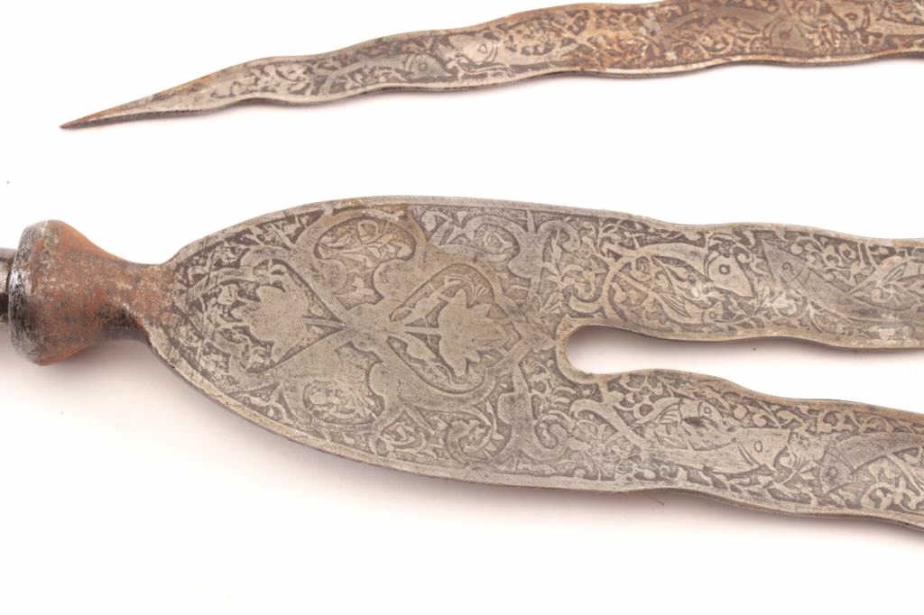 Lot of two fancy Indian etched spearheads from 19th century. Measures 22” in length. Very similar ornate etching. Est.: $175-$350