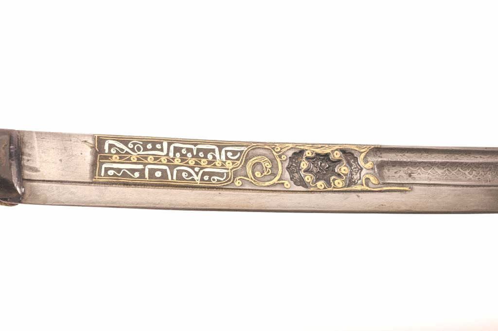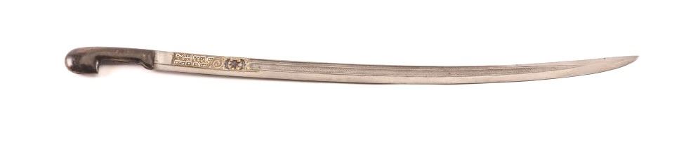 Caucasian sashka with exceptional damascus steel blade showing deep chiseling, gold and silver inlaid and makers mark. Also etching in blood grooves. Horn grip. No scabbard. Hard to improve on this blade. Goodcondition. The Dr. Leon A. Dale estate whose grandfather started collection in France Pre-1900. Est.: $1000-$2000