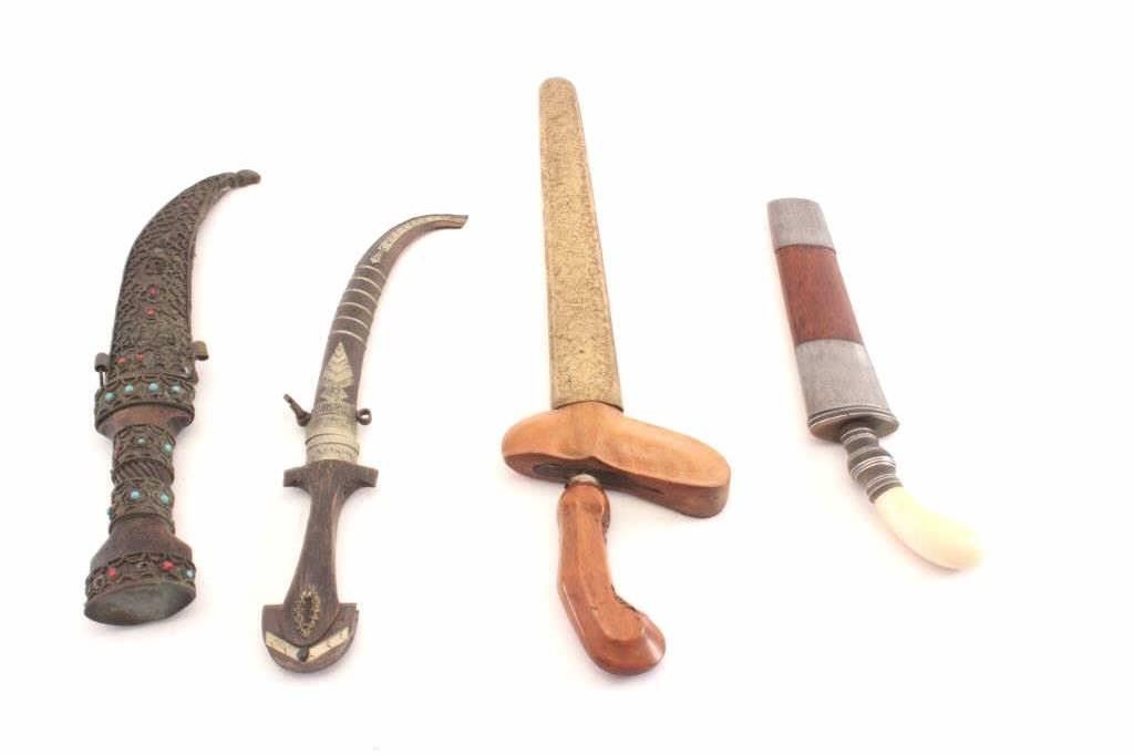 Lot of 4 ethnic daggers. 2 Malaysian and 2 Middle-Eastern. Varied condition. Fair to good conditions. The Dr. Leon A. Dale estate whose grandfather started collection in France Pre-1900. Est.: $250-$500