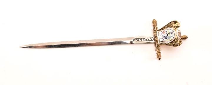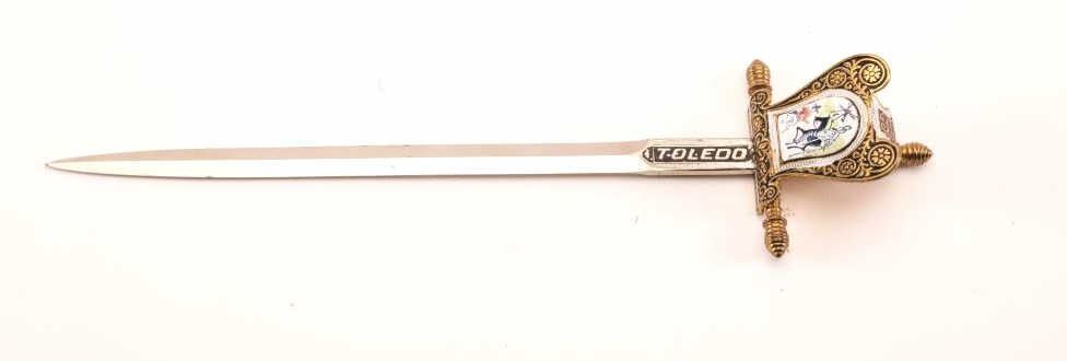 Lot of 2 miniature swords marked Toledo, Spain circa 1960s-70s. 1 enameled. Measures approximately 7 ½” and 8 ½”. Excellent condition. Est.: $150-$300