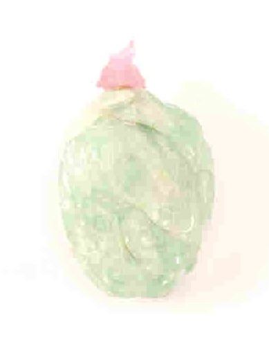 Antique Chinese carved jade snuff bottle with “Hand of Buddha” design. Purple stone stopper. 2” body. Blushes of bright green in light green to white jade body. 1800-1900 era. Est.: $300-$600