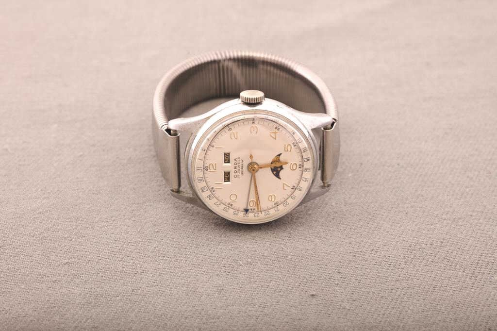 Vintage 1940s-50s Corda 17 jewel with sweep second hand, moon phase and 2 windows (Month). Runs well. Est.: $175-$350