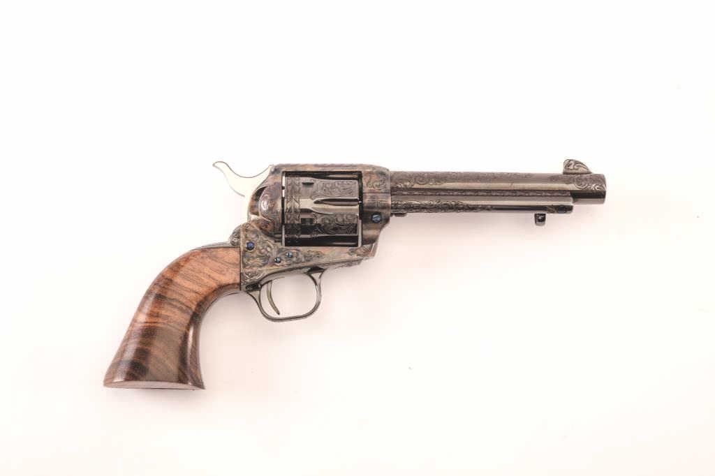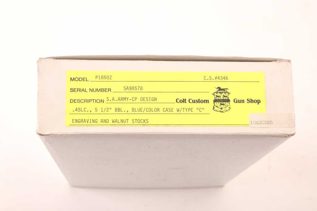 Colt SAA revolver in .45 L.C caliber with a 5 ½” barrel, factory “B” engraved by John Adams, walnut 1 piece grip added with original walnut included, S/N SA98578. 1 gun in shipment with letter in box with matchingend label. Excellent to mint. French style fitted case included. (Modern/No PPT) Est.: $2000-$4000