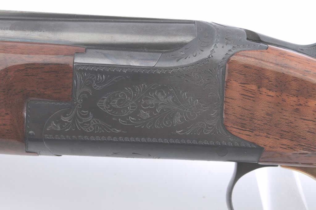 Browning Lightning Superposed 20GA O/U Shotgun with long tang and round knob, S/N P33PM1452 with 28” barrels choked full over modified with single trigger and auto ejector. Fine to excellent. 96%-99% overall.Minor use. Original butt plate. Luggage case. (Modern) Est.: $1500-$3000