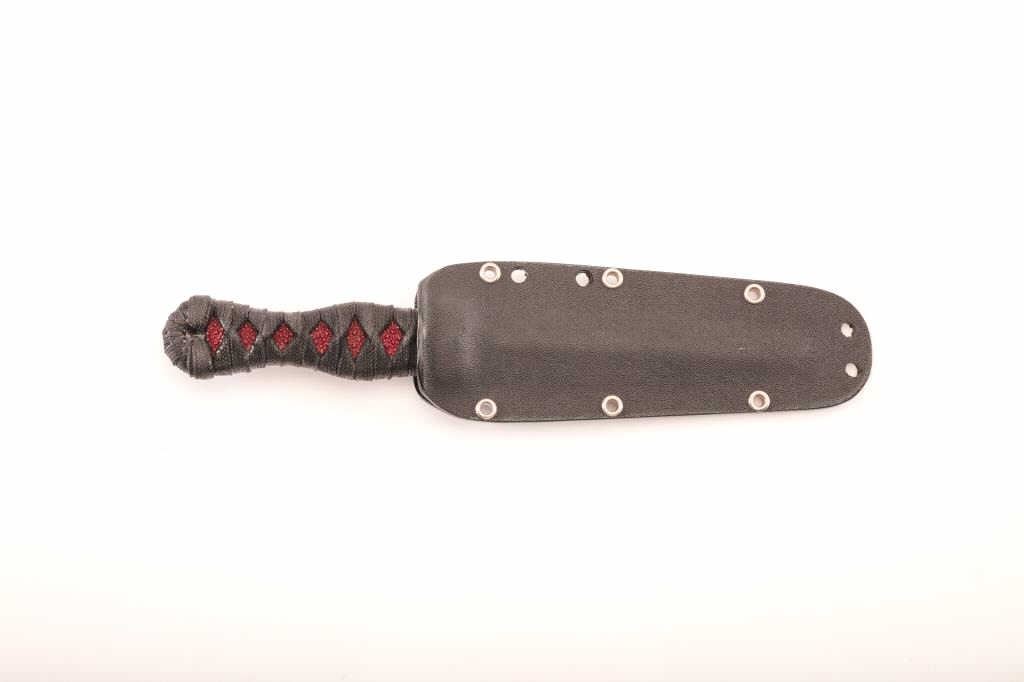 Japanese double edged Tanto dagger with plastic scabbard. The knife is 9” in total length with a 5” blade. The blade features a prominent hamon line and wrapped ray skin grips. The knife is in very good overallcondition and does not appear to have been sharpened. Est.: $200-$400.