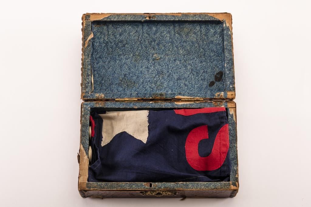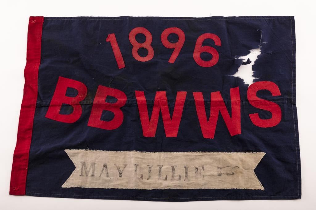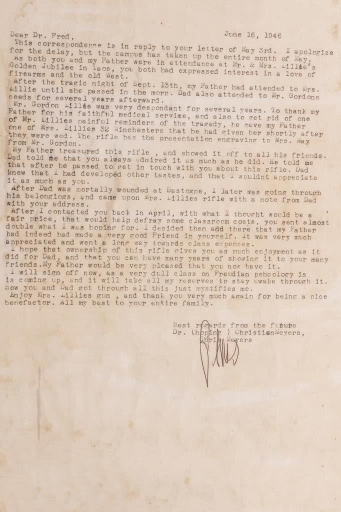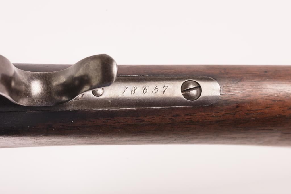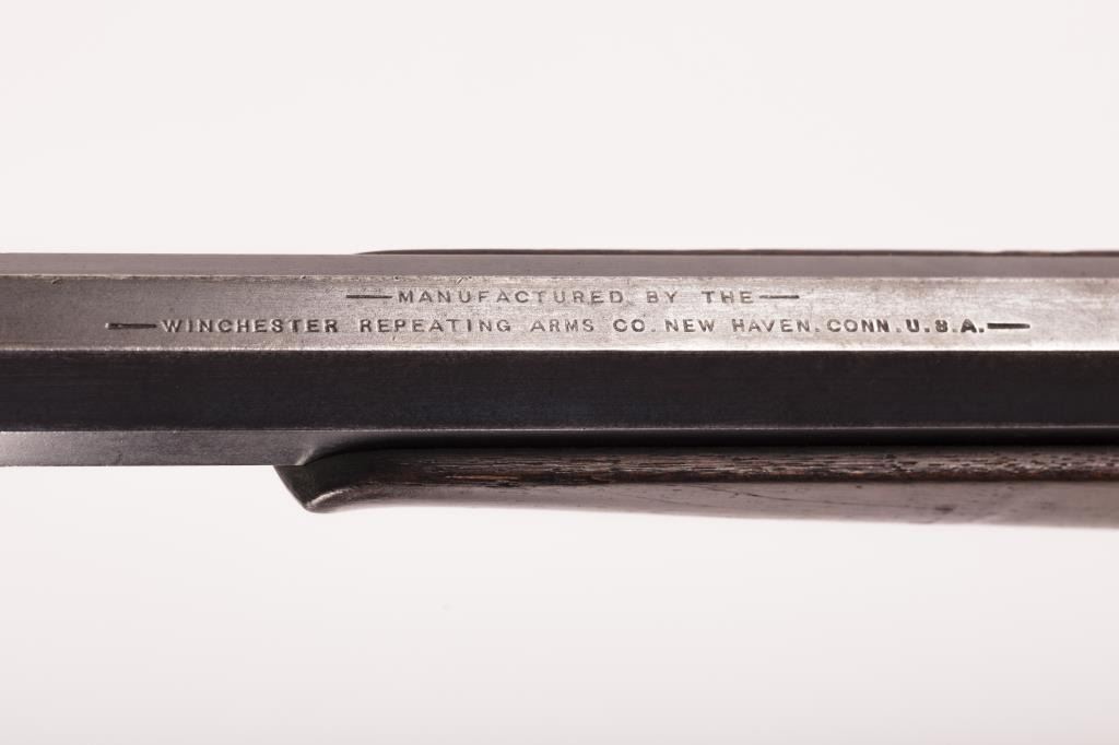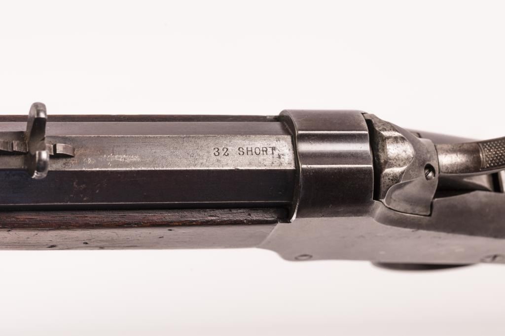 Winchester Model 1885 Low Wall rifle with ownership documented to “May Lillie” wife of Pawnee Bill and famous Wild West show performer and trick shot in the tradition of Annie Oakley who she competed with and preformed with in Buffalo Bill and Pawnee Bill shows. 24” octagon barrel in .32 rimfire caliber, S/N 18657. A period engraved silver plaque is affixed to center left of buttstock inscribed “Pawnee Bill, Historic Wild West, To Miss, May Lillie, My Straight Shooter, G.W.L.” (Gordon W. Lillie). A letter dated June 16, 1946 and signed Dr. Christian Meyers accompanies the lot and explains the gifting of this rifle to his father who had attended to May Lillie after a 1936 car wreck. Also a Swords Bros. (Photographers York, PA) carte of Lillie and Pawnee Bill is included with a studded and personalized vintage traveling box and an 1896 show banner, ladies gloves, signed playing card, key with stamped I.D. tag reading “May Lillie, B.B.W.W.S.”. This rifle is in good condition overall. A museum quality display devoted to the #2 lady shooter and performer in the Wild West show era who occasionally out shot Annie Oakley according to legend. (Antique) Est.: $10,000-$20,000