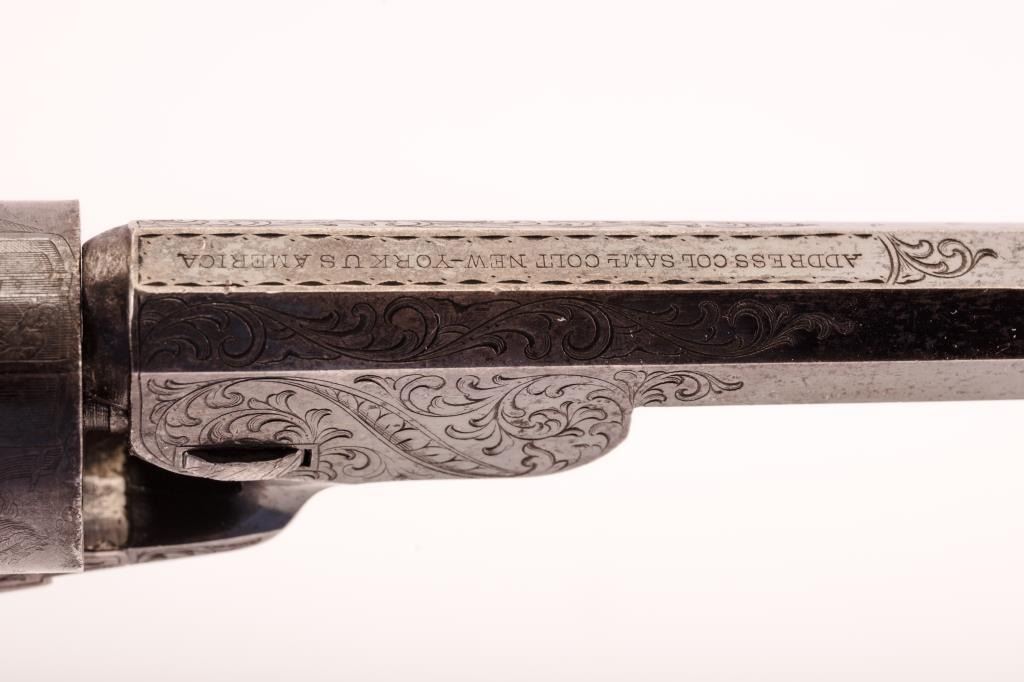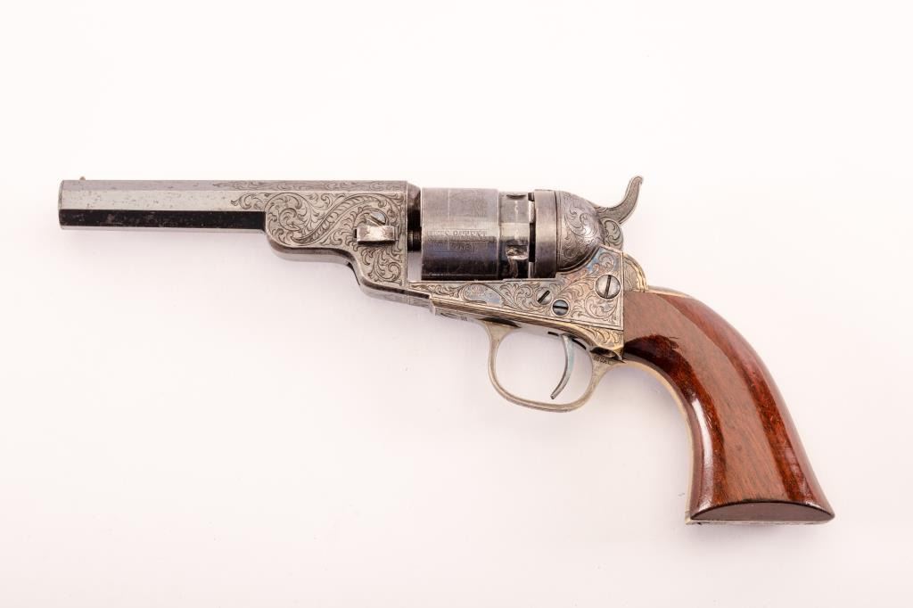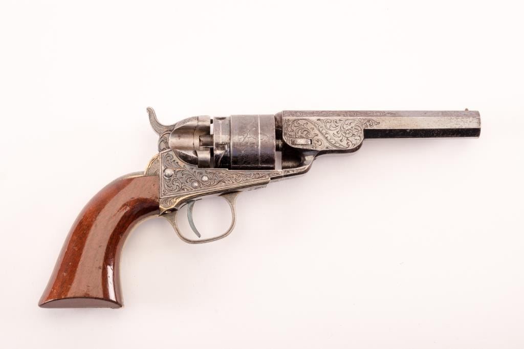 Colt .38 rimfire Pocket Navy conversion finely open vine scroll factory style engraved, blue and case colored finish, select varnished grips, S/N 19913 I. E. with 4 ½” plugged barrel using percussion parts.This revolver shows finely cut open vine scroll with 80%-90% bright blue and case colors remaining. The select varnished wood grips are excellent. The hammer shows insertion of firing pin through engravingindicating engraved as percussion and most likely never sold by factory until converting. The grips fit impeccably and are original to this Colt. Minor scratches and normal aging. Crisp action and bright bore.All matching including cylinder. Very few original engraved conversions are encountered with the desirable blue and case colored finish. (Antique) Est.: $5,000-$10,000