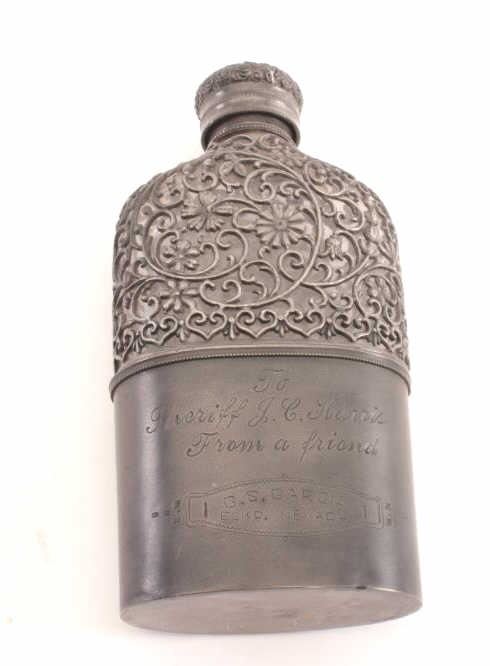 Pewter and glass pocket sized whiskey bottle inscribed, “To Sheriff J.C. Harris From a friend”. The bottle is approximately 6 ½” in height with an ornately decorated pewter cap and overlay in a vine and flower pattern.The base of the bottle is crudely block inscribed, “G.S. GARCIA ELKO, NEVADA”. The bottle is in good overall condition. Est.: $150-$300.