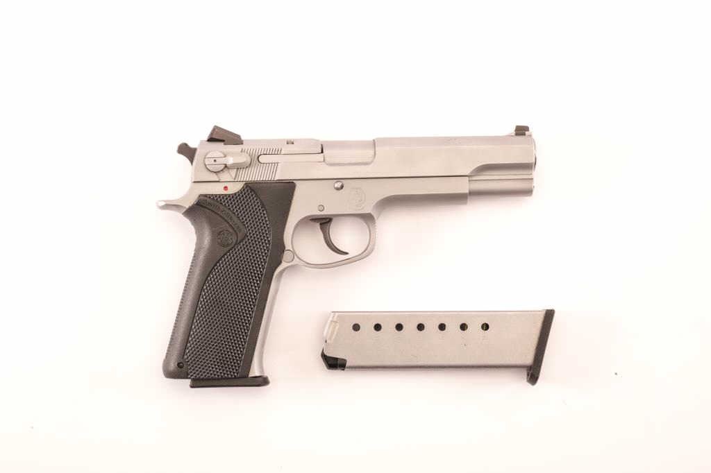 Smith & Wesson Model 4506-1 double action semi-automatic pistol, .45 caliber, Serial #VAU8209. The pistol is in fine overall condition with a 5” barrel. The pistol retains nearly all of its matte stainlesssteel finish with light handling marks. The checkered rubber grips are in very good condition showing little use. The bore is good, the action is crisp and the markings are sharp on this lightly used S&W. The lotincludes two correct magazines. Est.: $300-$600. (Modern/PPT).