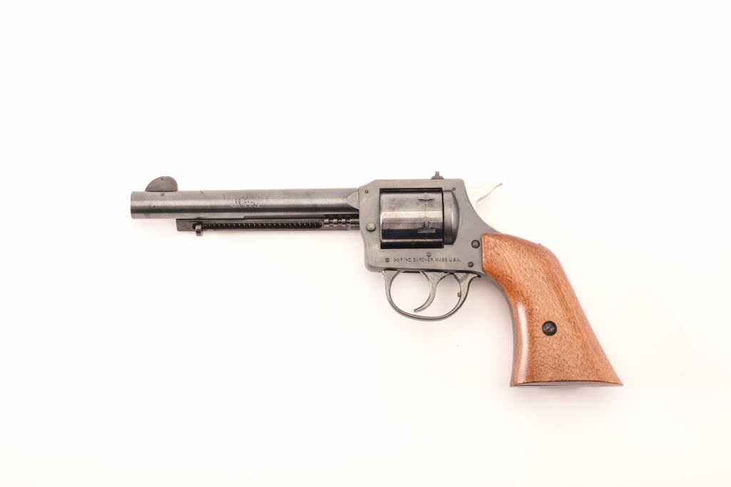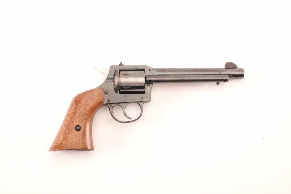 H&R Model 649 double action revolver, .22 caliber, Serial #AX118363. The pistol is in fine overall condition with a 5 ½” barrel. The pistol retains nearly all of its blue finish with areas of light surface rust onthe barrel and a faint drag line on the cylinder. The smooth wood grips are in very good condition with only light handling marks. Est.: $150-$250. (Modern/PPT).
