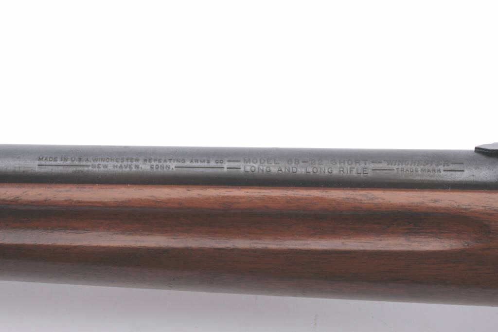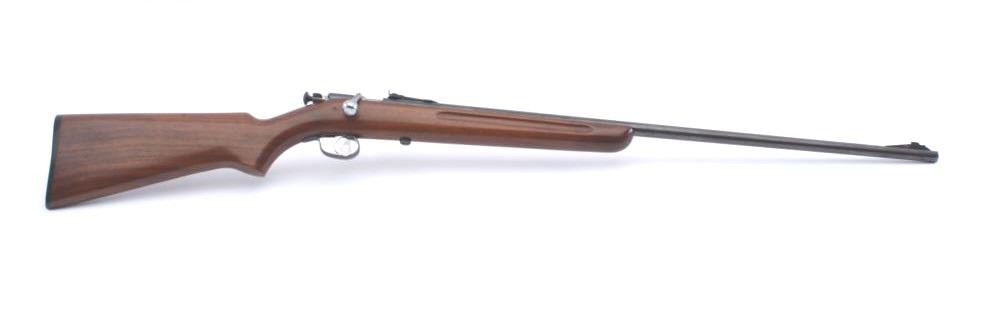 Winchester Model 68 bolt action single shot rifle, .22 caliber, Serial #NSNV. The rifle is in very good overall condition with a 27” barrel with a ramp front and aperture style rear sights. The metal surfaces retain themajority of the toning blue finish with small scratches and mars from field use. The smooth wood stock is in good condition with light compressions and the desirable finger groove fore end. The butt stock ends with acheckered plastic Winchester marked butt plate. The bore is dirty and may clean to fair, the action functions and the markings are crisp. Est.: $150-$300. (C+R).