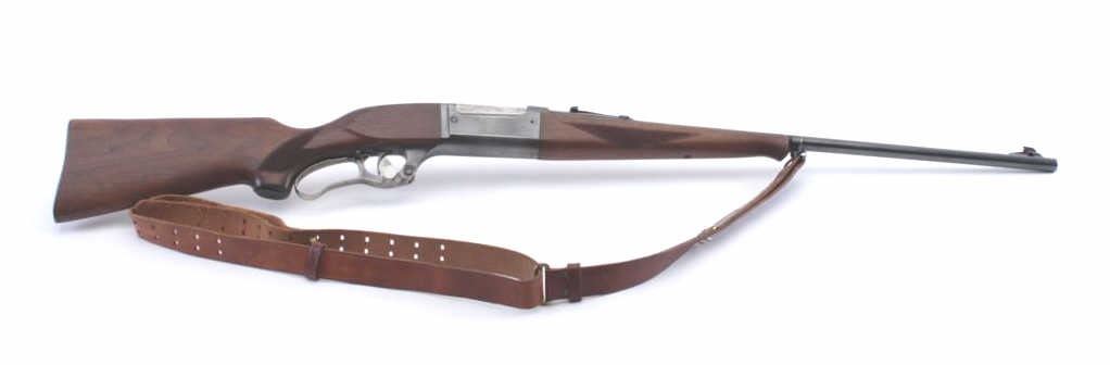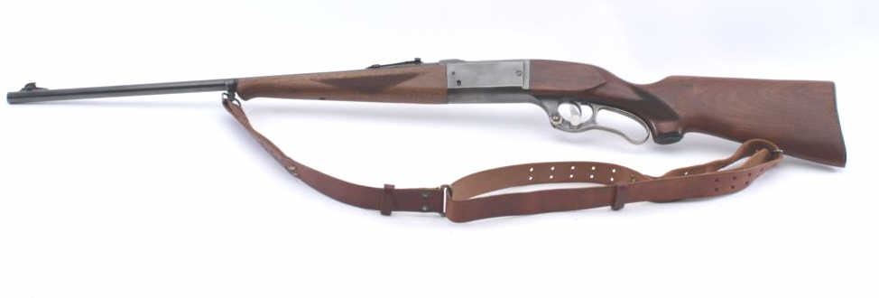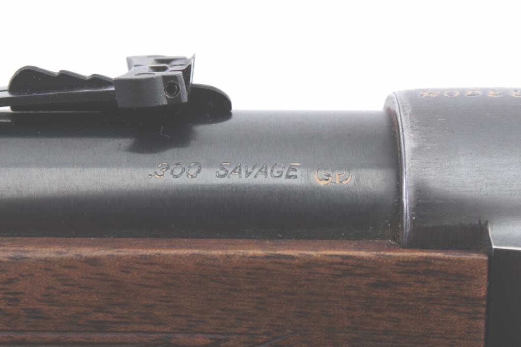 Savage Model 99 lever action rifle, .300 Savage caliber, Serial #672345. The rifle is in very good overall condition with a 24” barrel with a brass tipped ramped blade front and folding rear sights. The barrel retains a significant amount of toning blue finish while the receiver shows thinning blue and high point edge wear. The lever assembly shows vivid case hardening in the protected areas and there is a brass case counter onthe left side of the receiver. The checkered wood stock is in very good condition with small mars and dents. The butt stock ends with steel butt plate. The bore is good, the action is crisp and the markings are sharp. The lot includes sling swivels and a period leather rifle sling. Est.: $400-$800. (C+R).