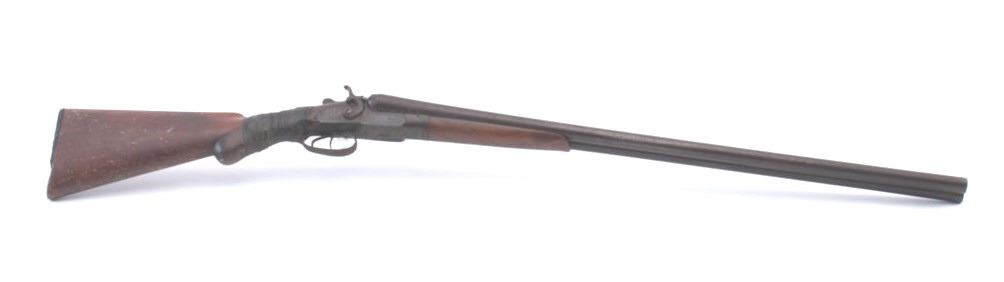J. Manton SxS exposed hammers shotgun, 12 gauge, 30” damascus barrels, dark patina to metal surfaces, wood stocks, no visible S/N; uncleaned condition with working actions, double triggers and broken stock at wrist,showing old tape repair; butt plate is missing lower 1.5” piece. (Antique). Est.: $75-$150.