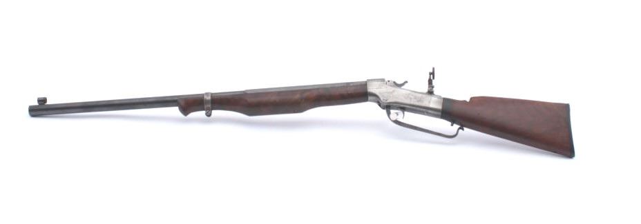 Early Marlin Ballard custom single shot rifle, .22LR caliber, 26” half round/half octagon barrel, blued finish, customized fore stock and butt stock, flip-up tang sight, hooded front sight, modified lever, S/N10269; overall good condition as customized with a good action, bore that should clean to good, barrel shows three areas tapped for scope mounts and a filled dovetail for a rear sight; old scratch marks on both rear flatsof the barrel. (Antique). Est.: $250-$500.