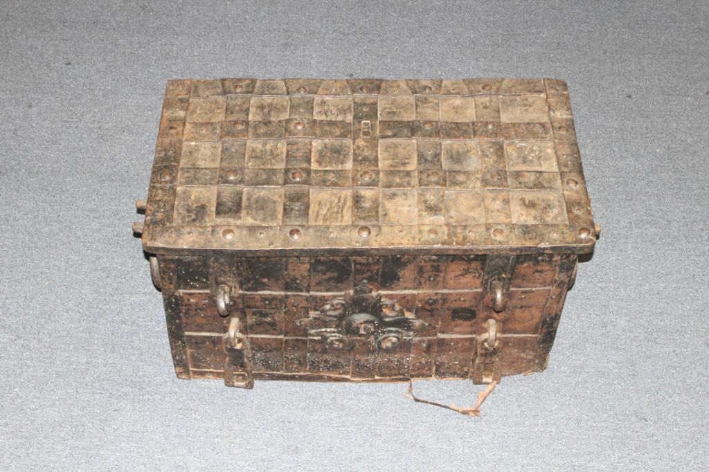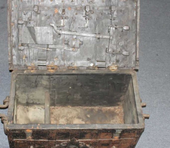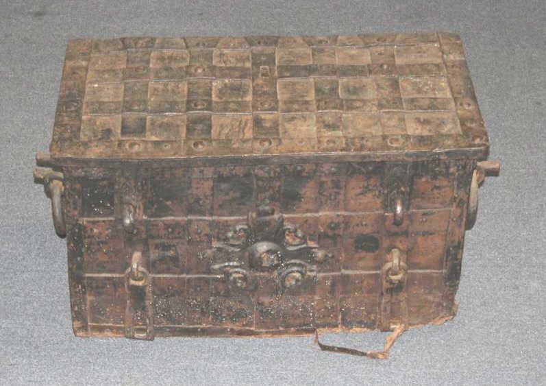 Spanish style treasure chest of forged steel circa 1650-1750. Measures approximately 21” tall x 31 ¼” wide. From the estate of Wm. Scollard noted Spanish Arms collector who had this chest in his Hacienda and obtained itin Portugal from museum curator Reiner Daneheart 1962. Santa Fe retail galleries $6,000-$12,000. Est.: $1500-$3000+++