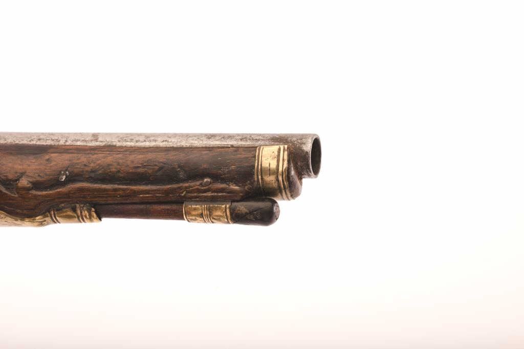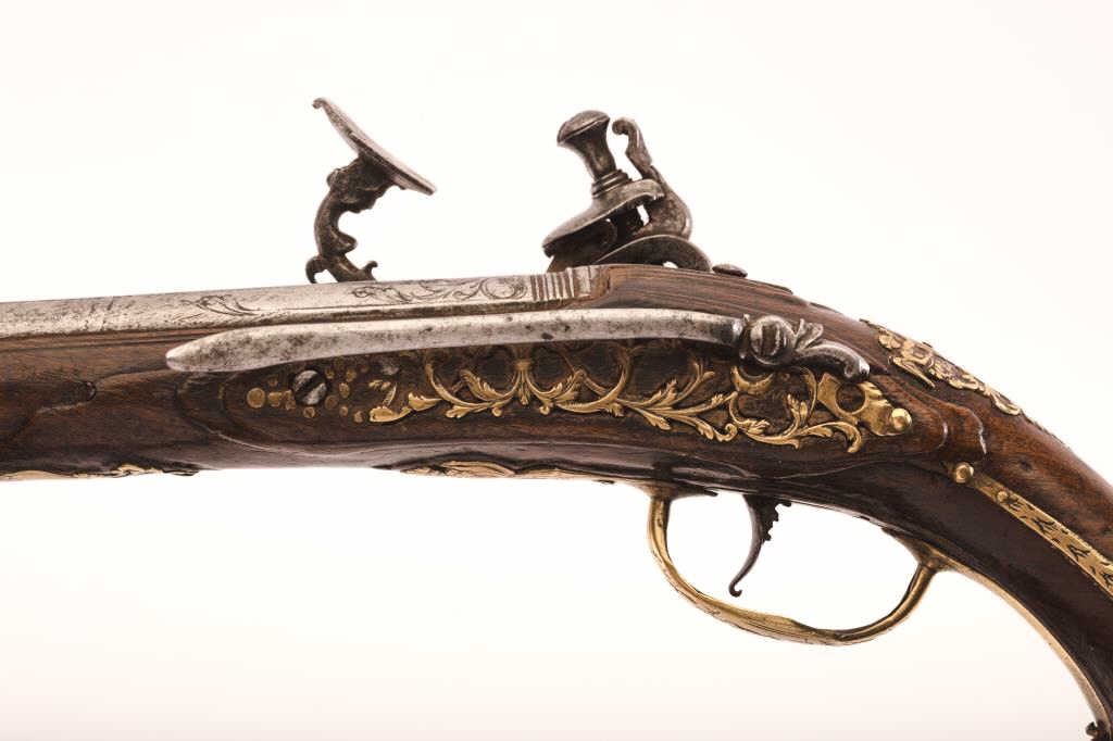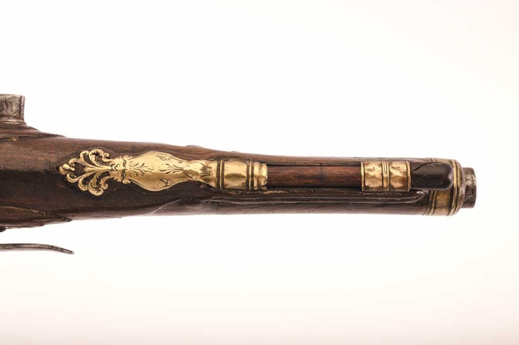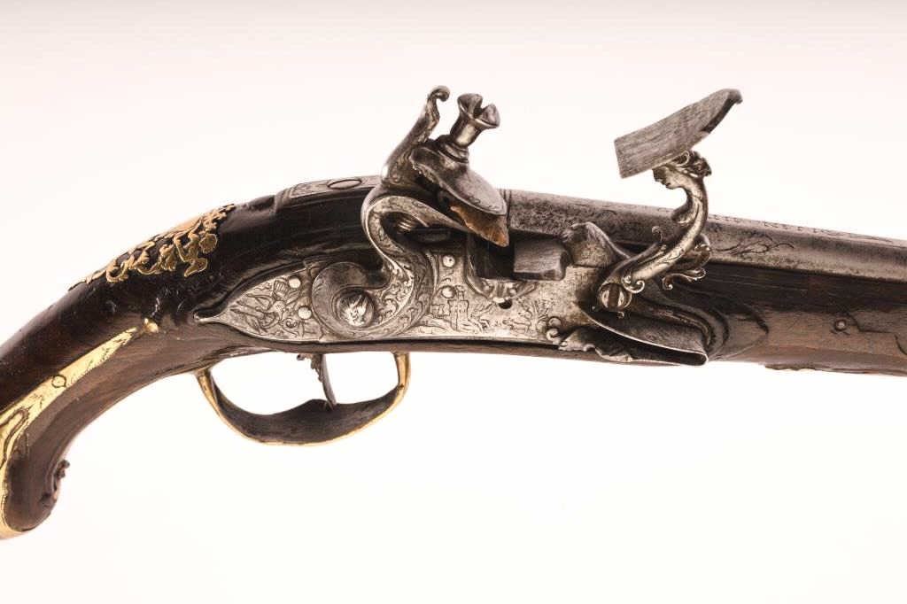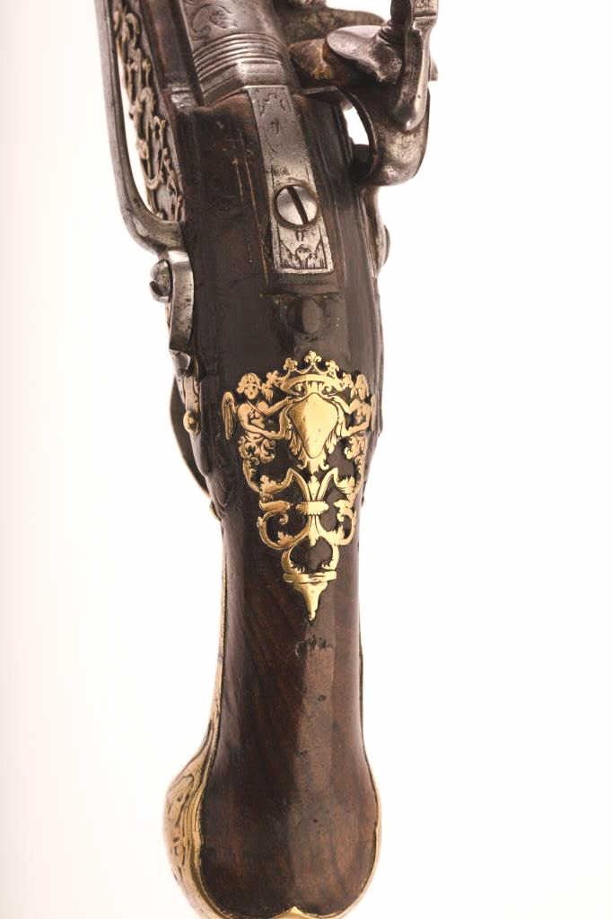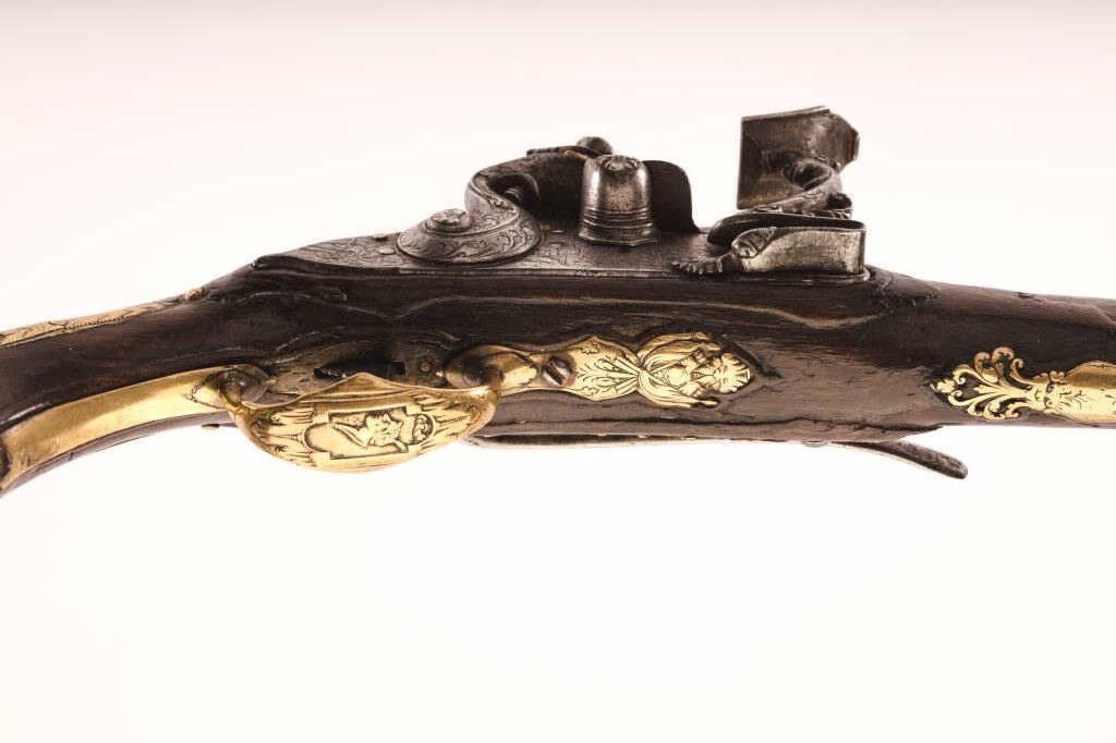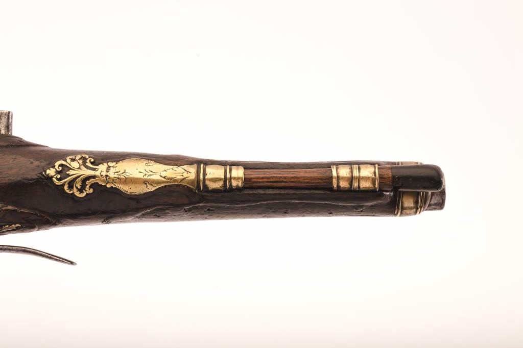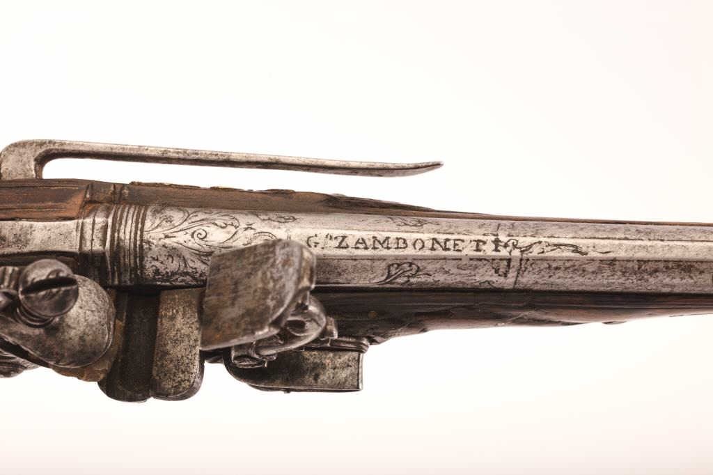 Pair of snaphance flintlock pistols by Giovanni Zambonetti circa 18th century with gilded brass engraved mounts formerly Joe Kundig collection. Measures 14” overall with 8 ¼” barrels of .44 smoothbore. Fineengraving and beautifully chiseled and sculptured frizzen with heads and piercing. (Antique) Est.: $6,000-$12,000