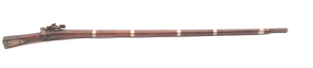 Caucasian Miquelet Flintlock Musket with fine and ornately gold damascened barrel and lock. Tigger stripe maple stock. Soft metal silver colored mounts. Shows missing back section of buttstock, some damage to foreend, rust and erosion. Needs cleaning and restorations. As found in attic of collector’s estate. Measures 56” overall with a 46” barrel. Note makers stamp on barrel and lock may be Turkish. (Antique) Est.:$1000-$2000