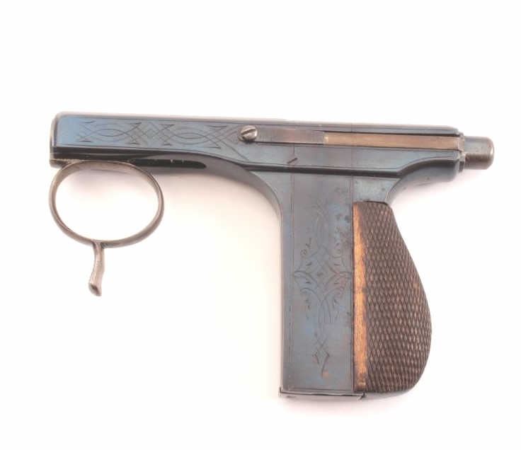 French Brun-Latrige palm squeezer 6MM pistol with fire blued finish and checkered “half grip” panel at rear. Working and very good overall. A rare mechanical oddity that is seldom offered on collector’s market. Circa1880’s. (Antique) Est.: $1400-$2800