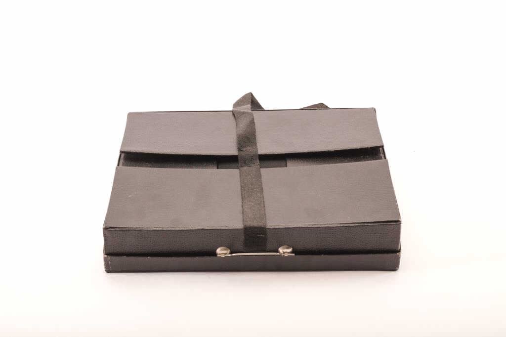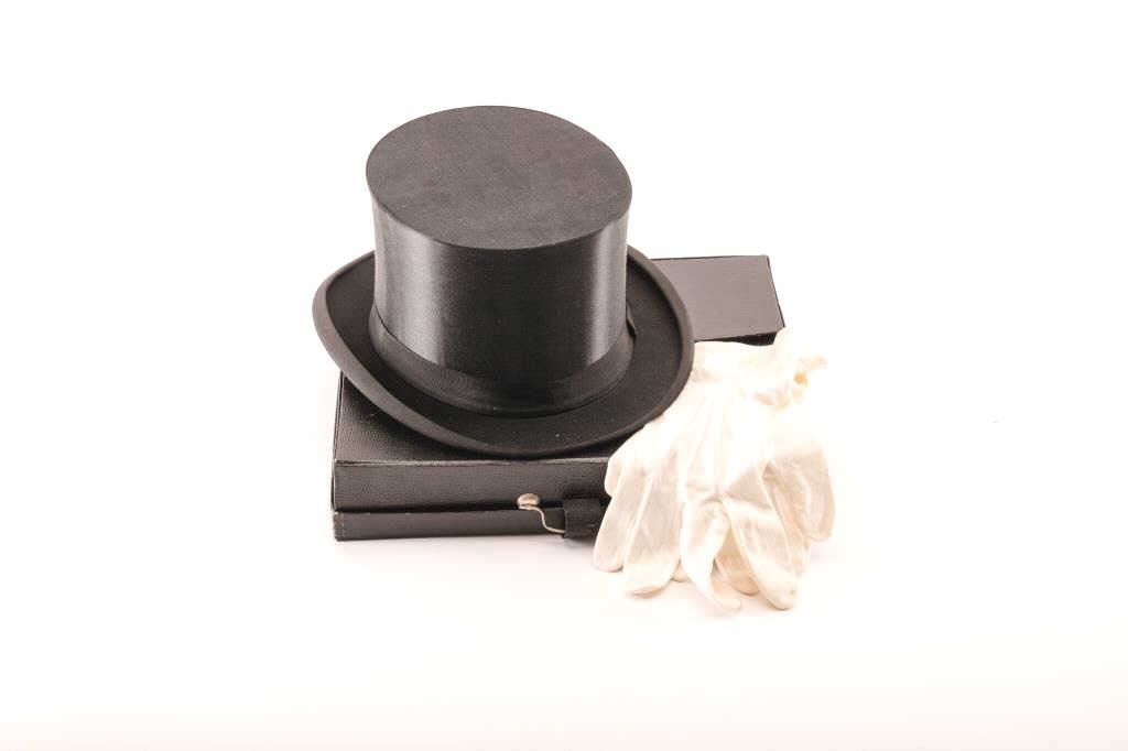 Druckfrei-Delhsches Fabrikat collapsible top hat, case and pair of white gloves, in carrying case. Approximately size 7 3/8-7 1/2. good condition overall. Est. $75-150