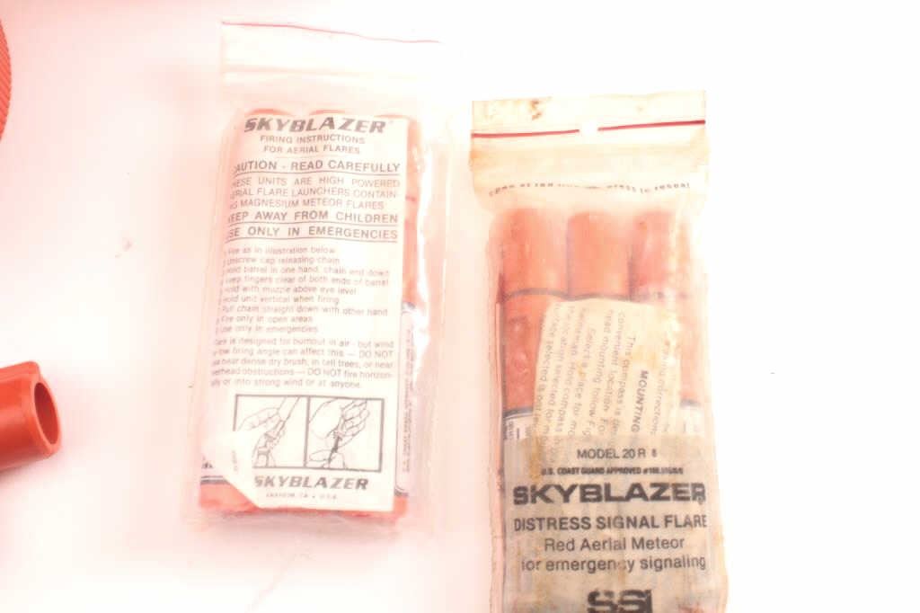 Olin Marine signal kit, including 12 Ga. signal flare launcher, 9 distress signal flares, 5 hand held flares and one hand held smoke distress signal, enclosed in an orange plastic container. Est:$75-150