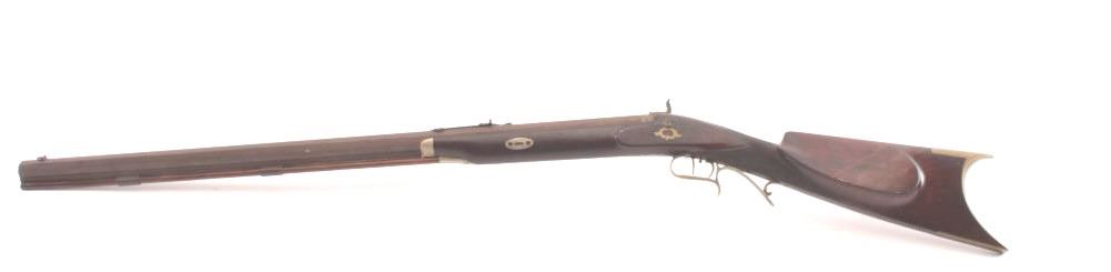 American 1/2 stock plains to target rifle in late Philadelphia style (similar to Wurflein) but unmarked other than No.2 on barrel. 30 1/2" octagon barrel in .40 cal., rifled. Double set triggers, sights in originaldovetails, but of later era about turn of the century or slightly later. Very good wood and triggers work. Circa 1860-70's. Est. $350-700