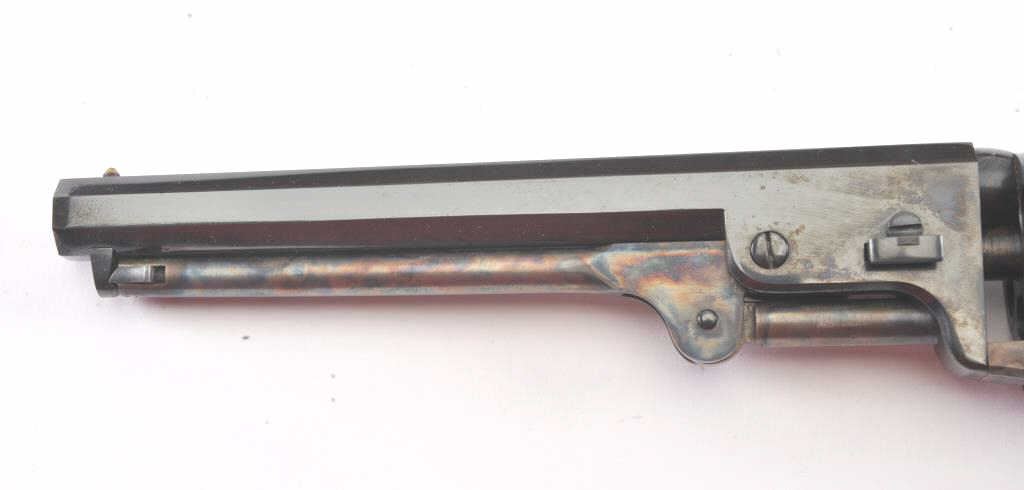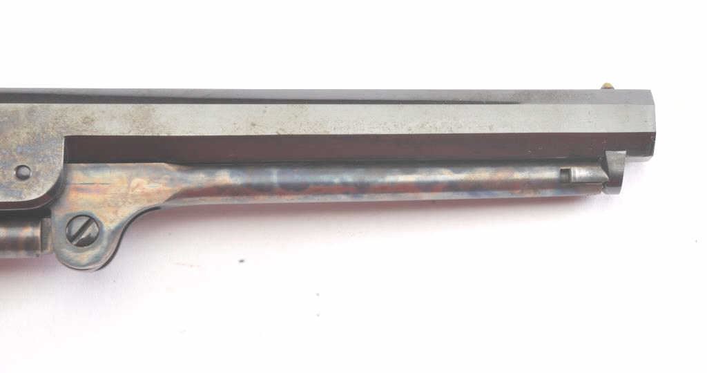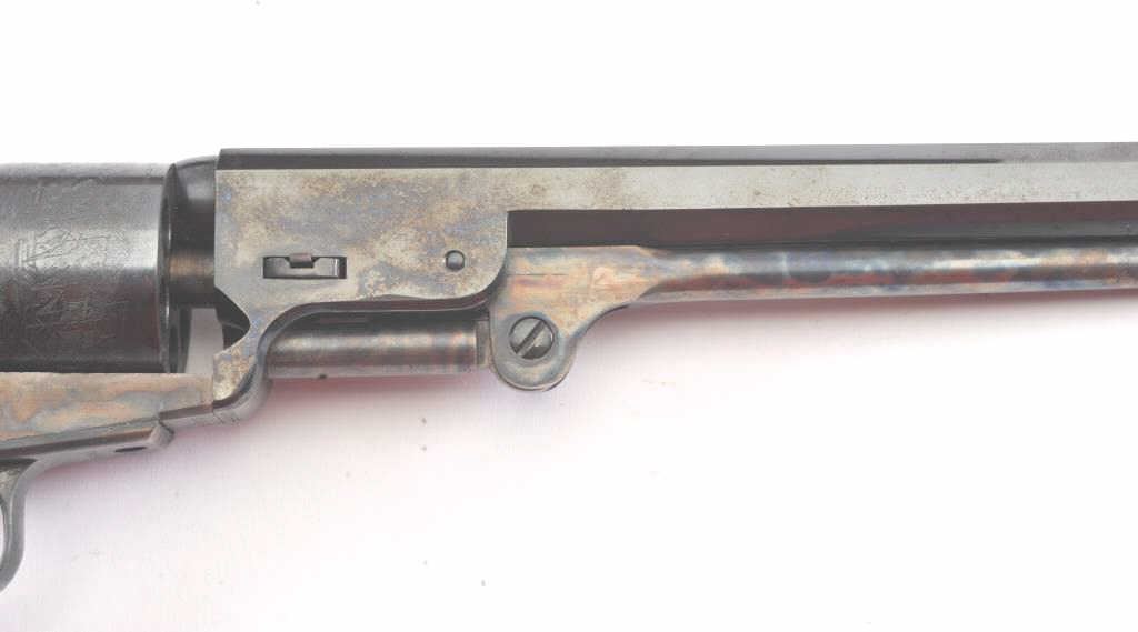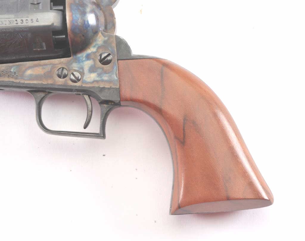 Colt Blackpowder Series Model 1851 Squareback Navy percussion revolver, .36 caliber, 7.5” octagon barrel, blued and case hardened finish, wood grips, S/N 13054; overall near new condition with factory cardboard box;consecutive to S/Ns 13045 thru 13053. (Percussion). Est.: $500-$1,000.