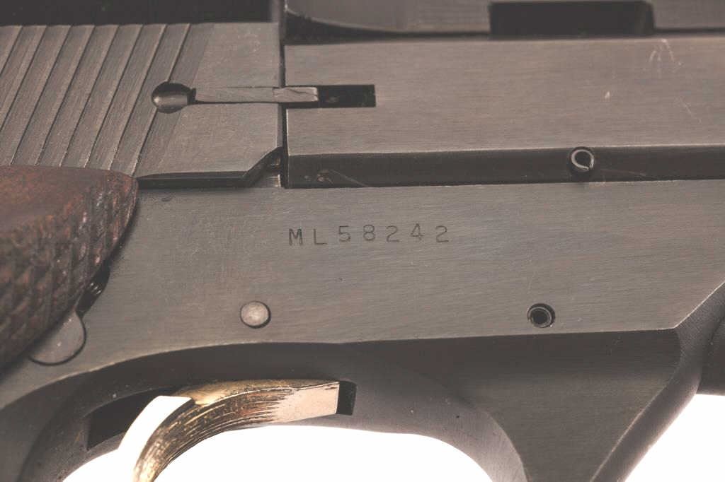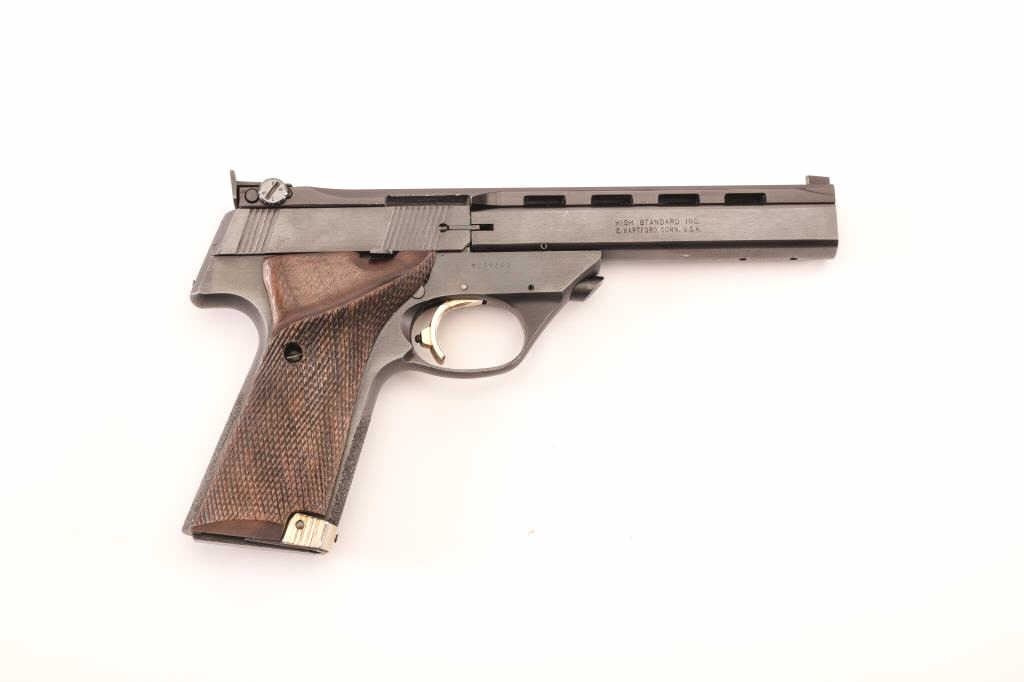 High Standard Victor Model semi-automatic pistol, .22LR caliber, 5.5” ventilated rib barrel, blued finish, checkered wood grips, gold accented trigger, safety and magazine release, S/N ML58242; overall fine conditionwith majority of original blued finish, fine bore, crisp action, sharp marki9ngs and fine grips. (Modern/PPT). Est.: $300-$600.