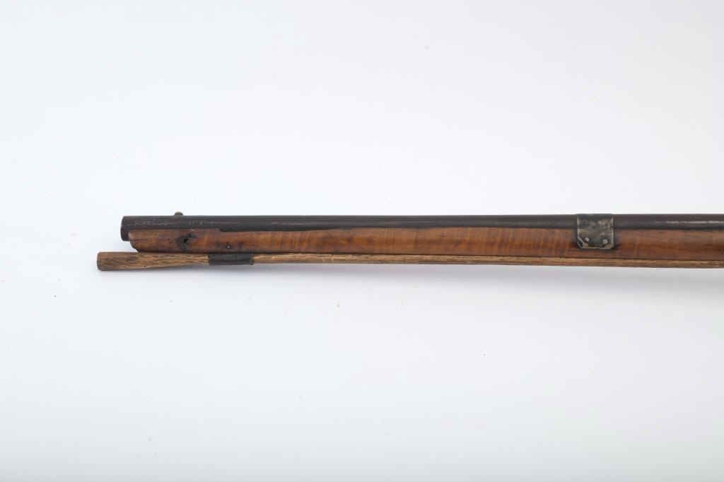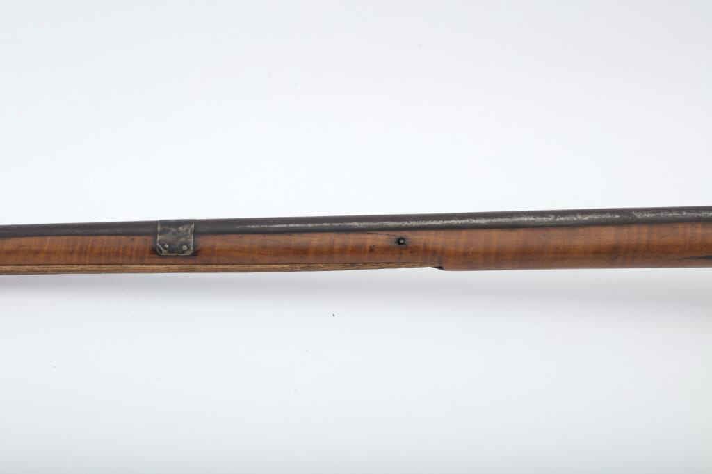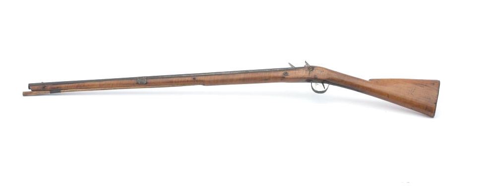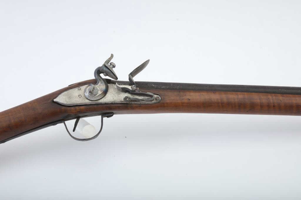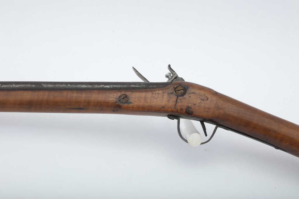 Flintlock American style trade gun with light colored stock showing striping possibly American maple. Measures 47 ½” overall with a 32” barrel in 20GA showing no markings or proofs. The lock has been reconverted nicelybut left unpolished and needing final finishing’s. Old nailed sheet metal to tighten barrel to the stock. Crack in the stock by the lock screw but otherwise good wood. Nailed sheet copper butt plate. No side plate and thin steel trigger guard. An unusual trade gun with American wood. (Antique) Est.: $150-$300