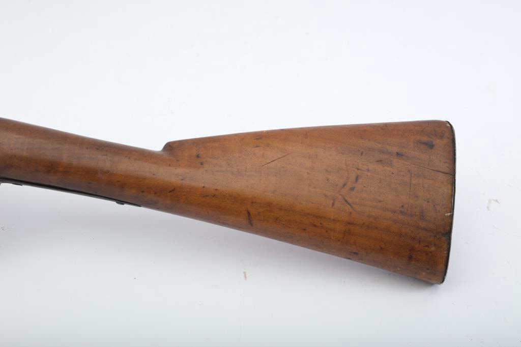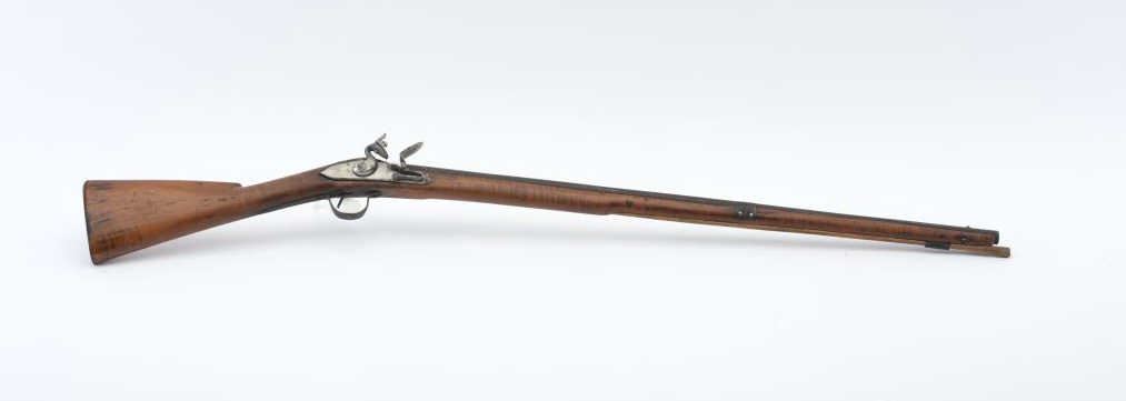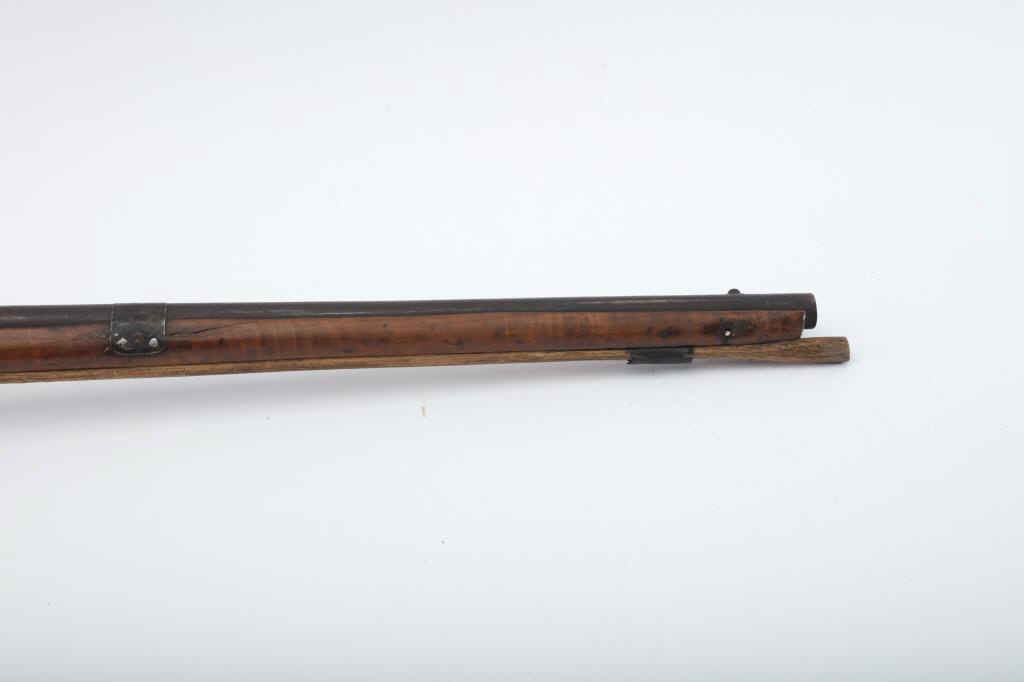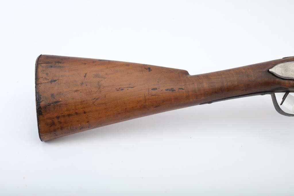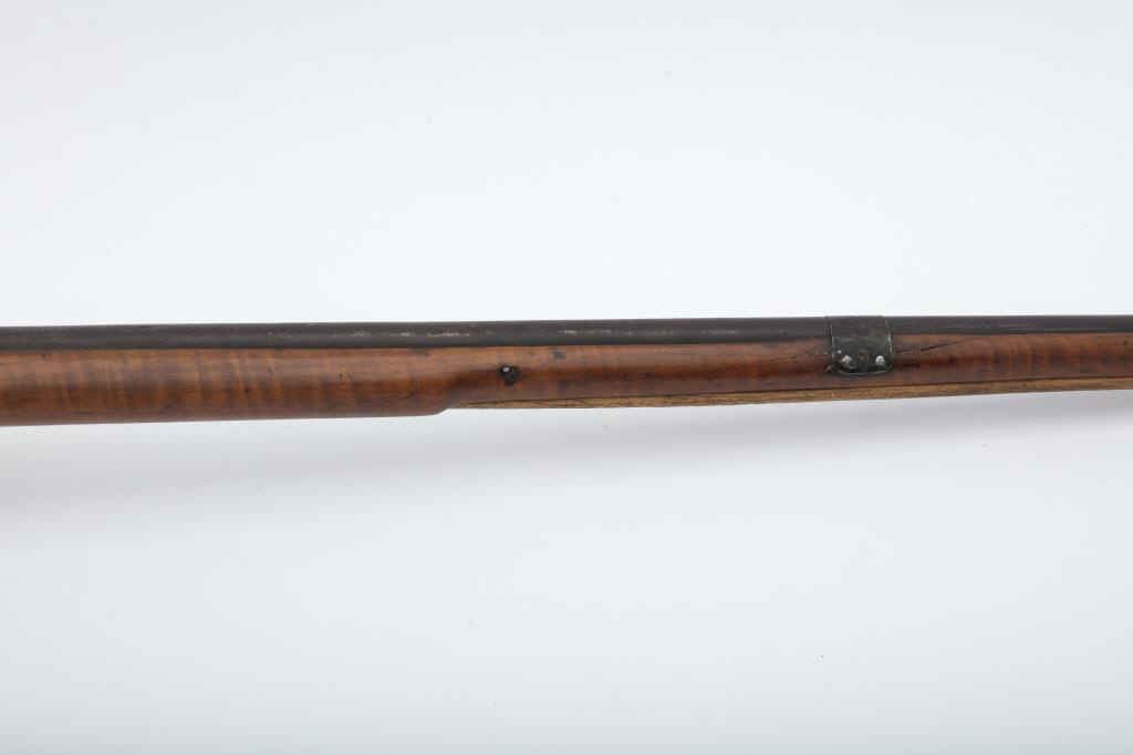 Flintlock American style trade gun with light colored stock showing striping possibly American maple. Measures 47 ½” overall with a 32” barrel in 20GA showing no markings or proofs. The lock has been reconverted nicelybut left unpolished and needing final finishing’s. Old nailed sheet metal to tighten barrel to the stock. Crack in the stock by the lock screw but otherwise good wood. Nailed sheet copper butt plate. No side plate and thin steel trigger guard. An unusual trade gun with American wood. (Antique) Est.: $150-$300