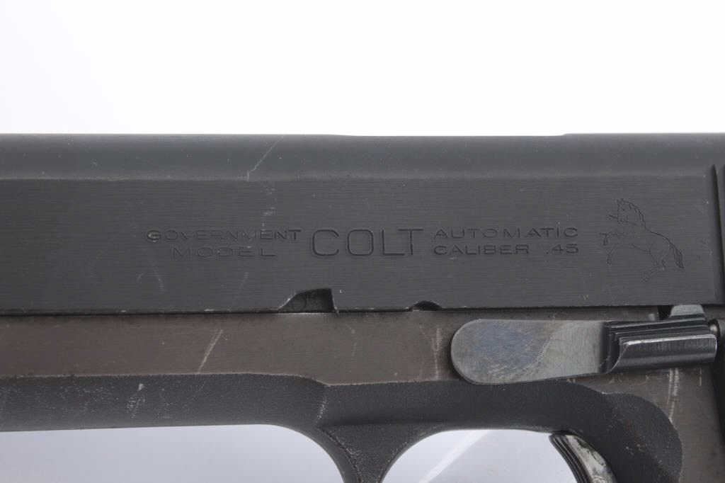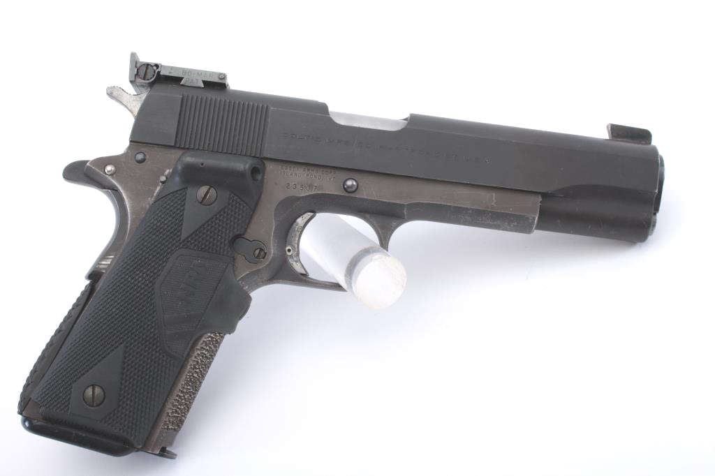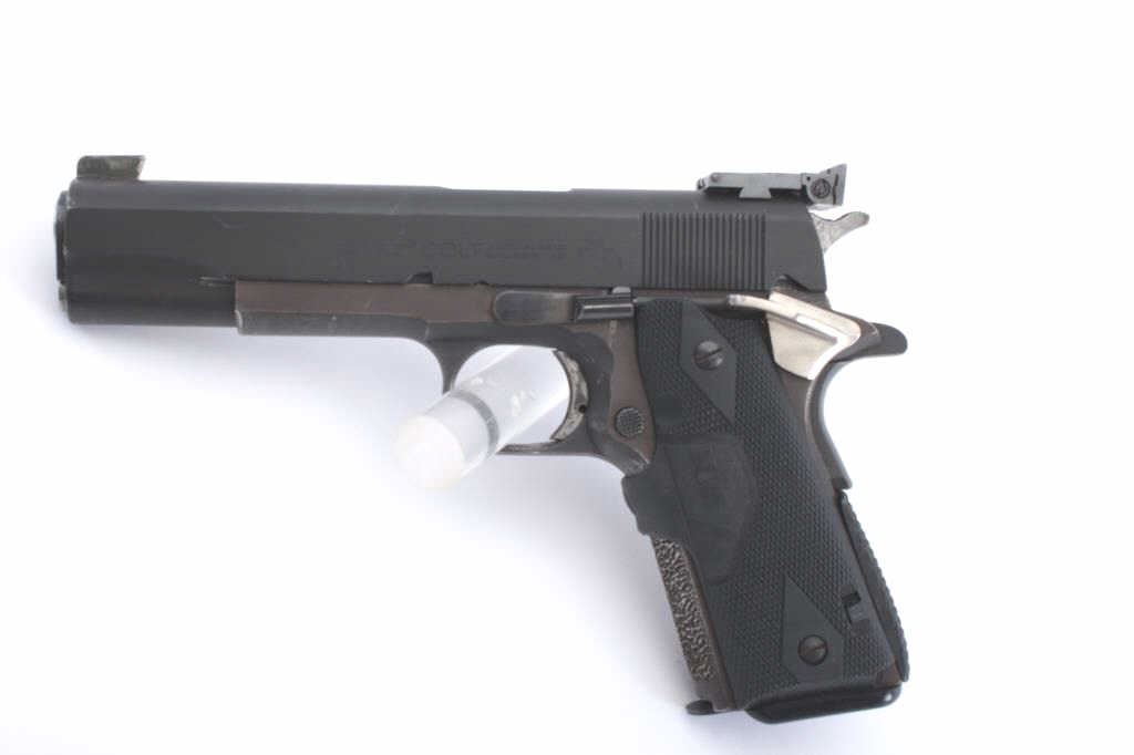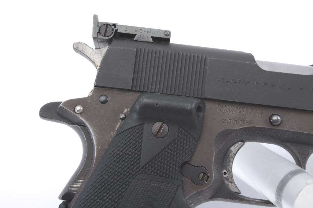 Custom built Colt .45 on Essex frame, #23537, Colt upper with Bo-Mar adjustable sights, extended, safety, stipled front strap, mag funnel and NRA rubber laser grips. Pistol is in good condition overall, stainless barrelwith good bore, action is good, grips are good with functioning laser. (Modern) Est. $600-1200