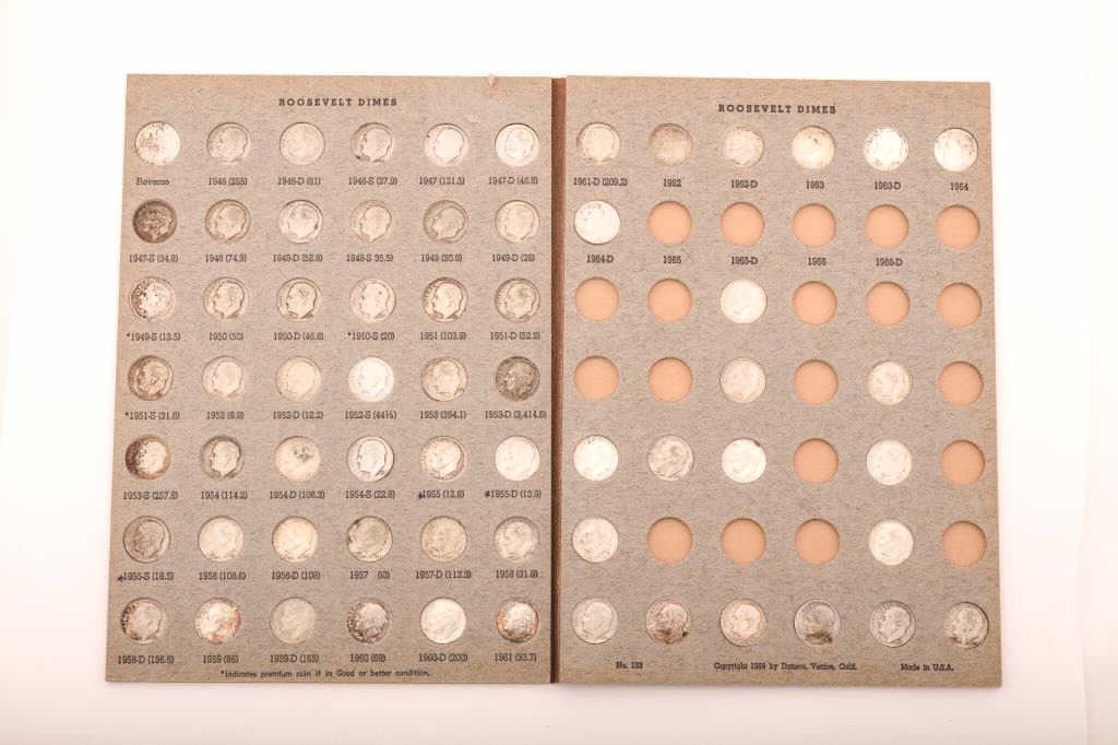 A collection of 64 Roosevelt silver dimes from 1946-1964 in a Dansco album Est:$75-100