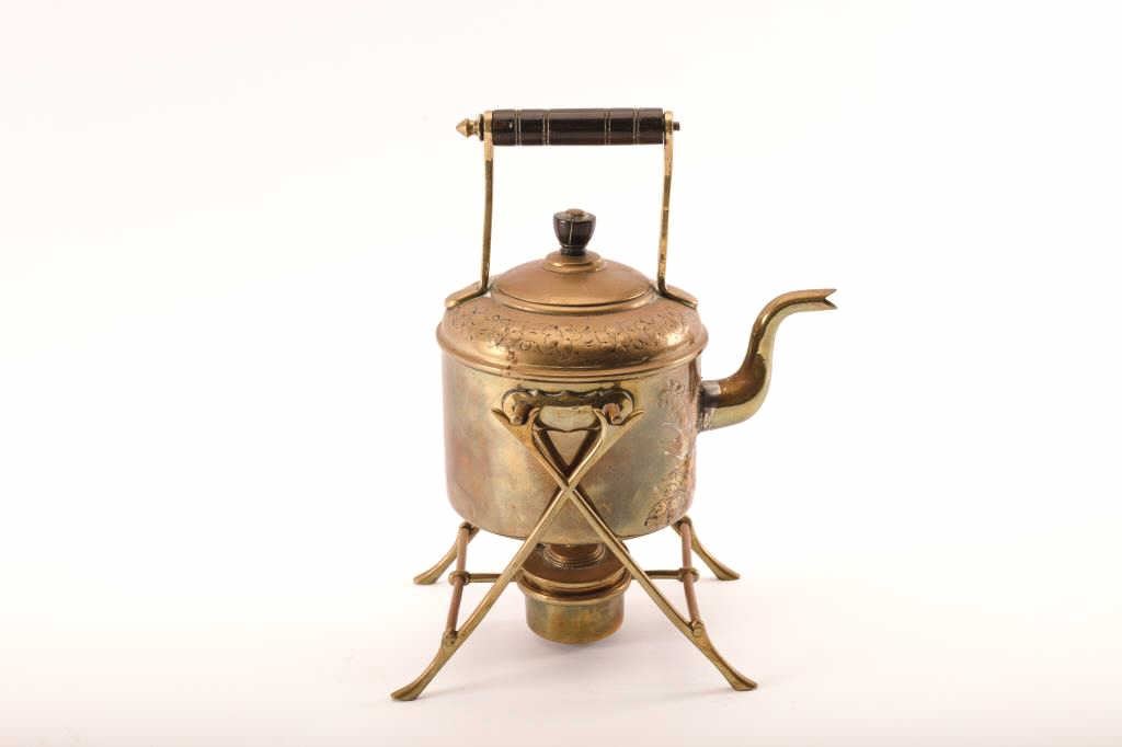 One vintage brass samovar type of teapot with stand and oil heating burner Est:$50-100