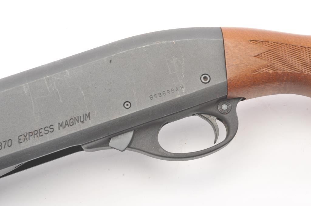 Remington Model 870 Express Magnum pump shotgun, 12 gauge, Serial #B686984M. The shotgun is in fine overall condition with a 28” barrel with a full-length ventilated rib. The shotgun retains nearly all of the matte blue finish with a couple spots of light surface rust on the barrel. The magnum receiver is marked for 2 ¾” and 3” shells. The checkered wood stocks are in very good conditions with small mars and scrapesconsistent with field use. The butt stock ends with a solid rubber recoil pad providing a 14” LOP. The bore is good, the action is crisp and the markings are sharp. Est.: $200-$400. (Modern).